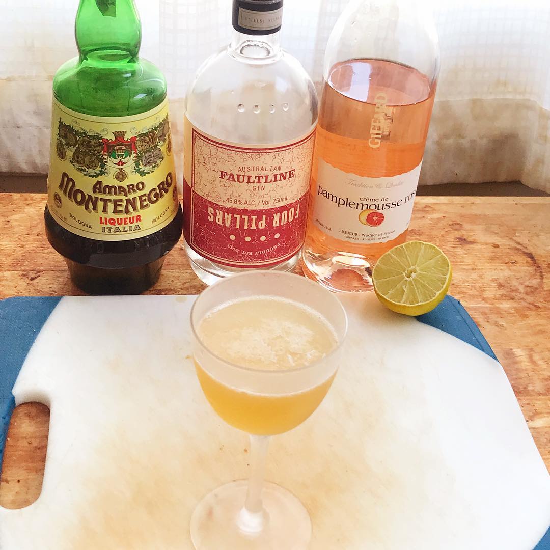 The use of grapefruit liqueur and the bittersweet, cinnamon-accented Amaro Montenegro mimics the classic Tiki ingredient Donn’s Mix (grapefruit juice and cinnamon syrup) that gives the drink a juicier and more spice-forward flavor than the traditional Chartreuse and Maraschino. The juniper and other botanicals in the gin work well with the spices and the bitter juiciness in the combination of lemon juice and grapefruit liqueur .75 oz Gin (slightly higher proof (90) bottle like Beefeater 24 or Four Pillars/Faultline is a great choice to make sure flavors balance)