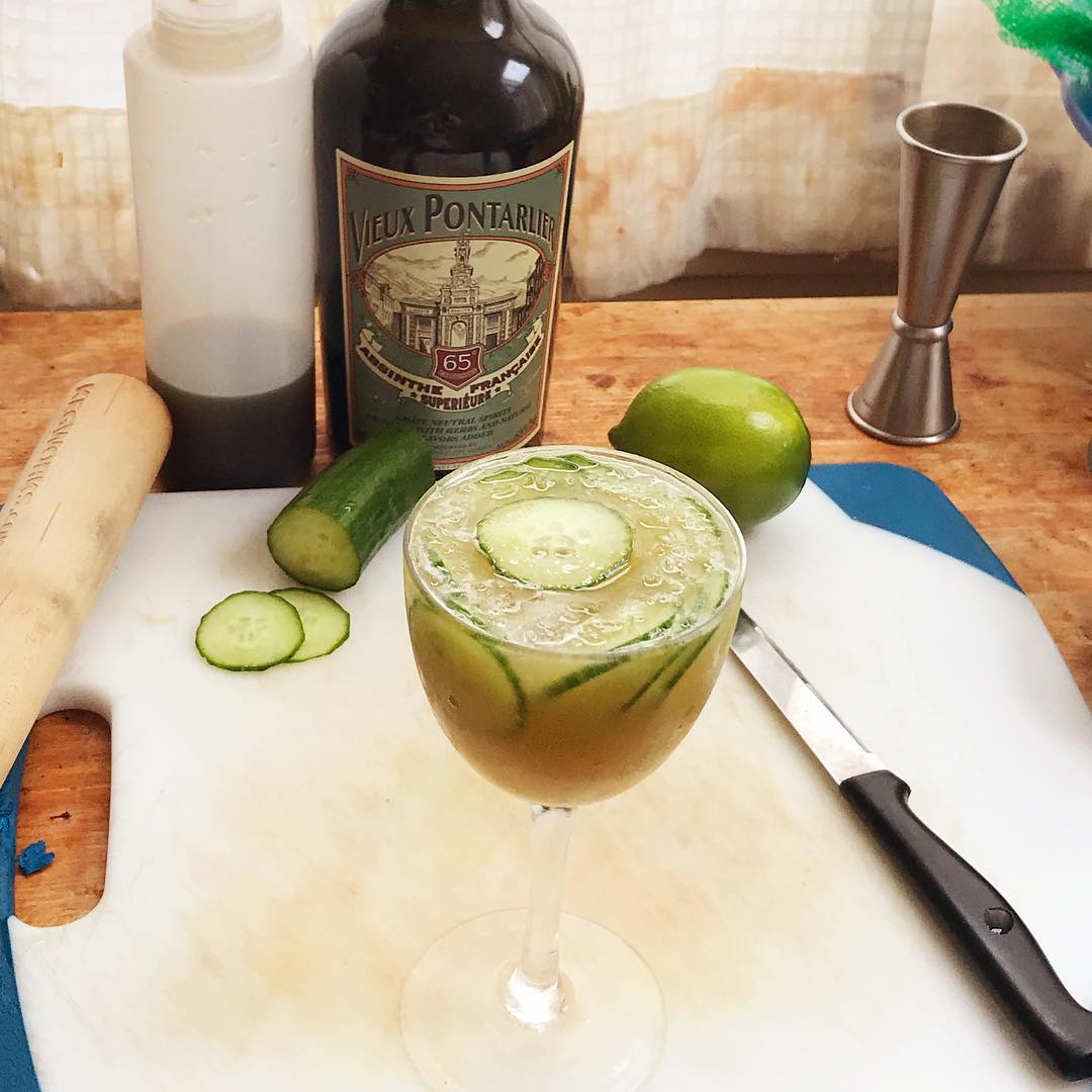 An Absinthe Frappe/daiquiri riff from NYC’s Thomas Waugh that features plenty of the namesake 🥒 and is perfect for drinking around a pool or outside in the summer