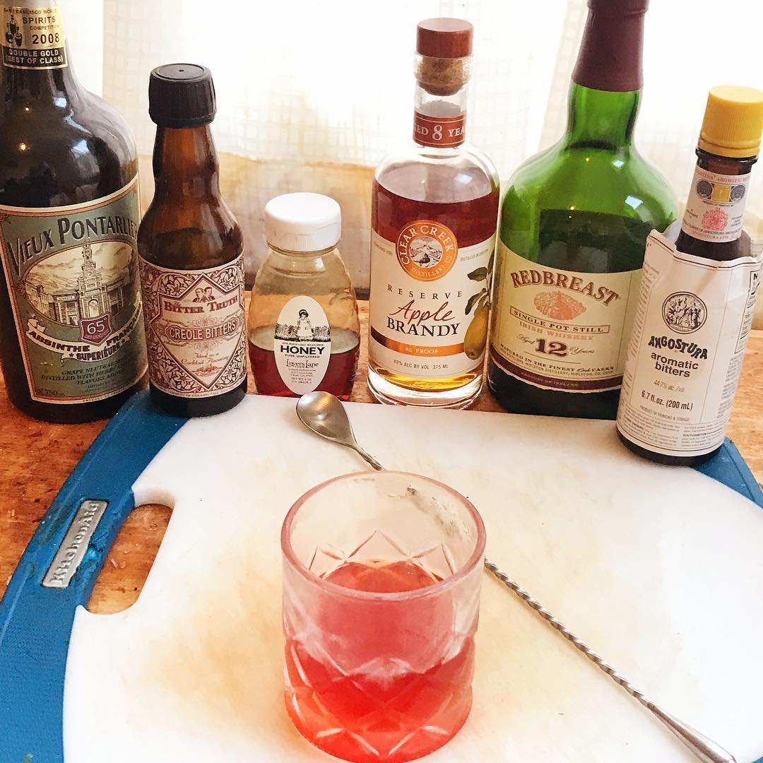 The cereal and honey notes from the Irish whiskey support and round out the ripe apple flavor of the brandy while the absinthe rinse and addition of Peychaud’s bitters add a hint of anise and spice. Very tasty and great for sipping after dinner to stay warm in the cold