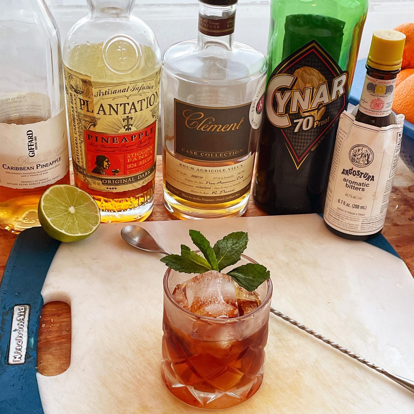 The Creme brûlée, vanilla, and brown sugar notes of the aged Agricole rhum combine with the rich roasted pineapple flavors of the infused rum to Crete a flavorful base that works nicely with the medium bittersweet Cynar. The essential oils and touch of citrus from the muddled lime peel help brighten the flavors and touches of pineapple liqueur and Angostura boost the tropical fruit and baking spice notes while the fresh mint adds a pleasant aroma