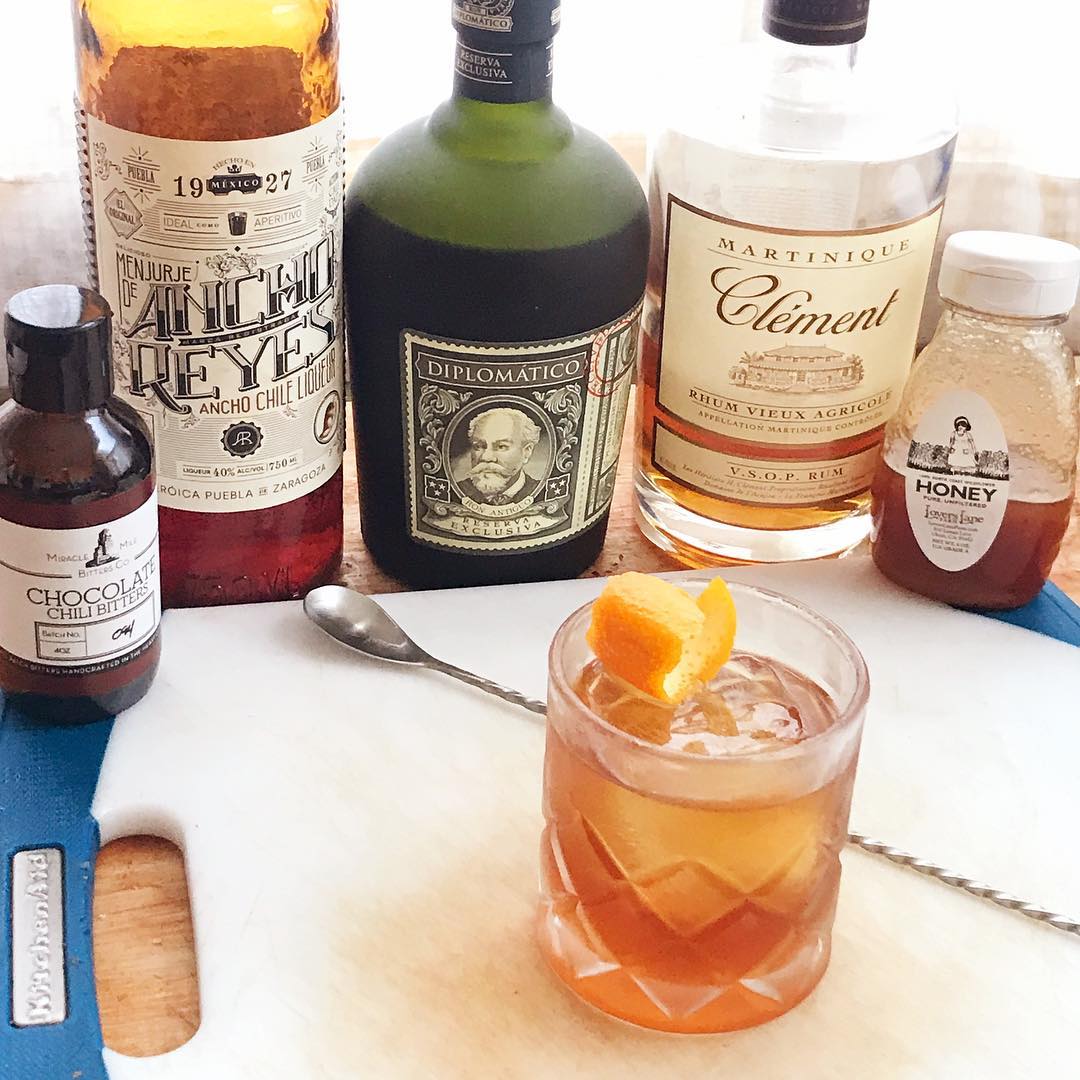 The ancho chile liqueur and honey syrup work with the molasses and sugarcane notes of the rum to bring a deep sweetness with a spicy tingle at the finish (enhanced by the Bitters). The orange oils from the twist enhance the aroma