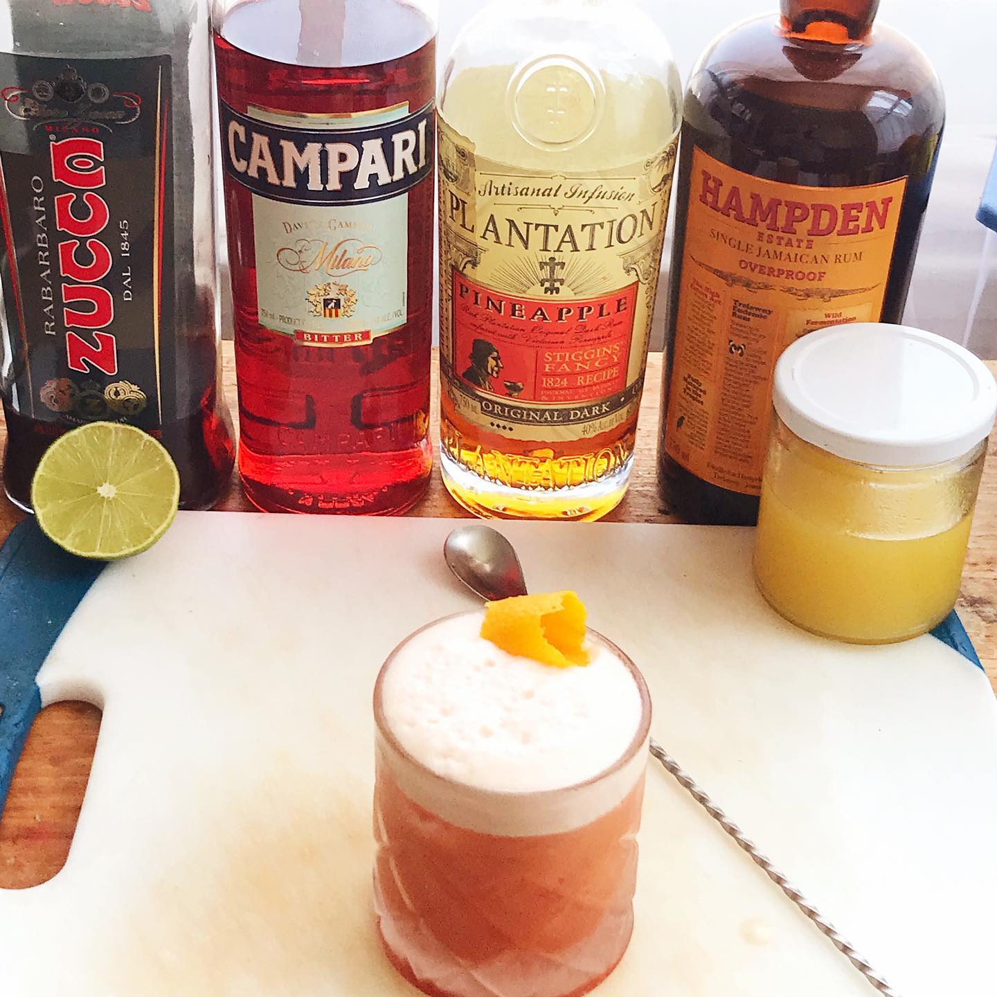 The pineapple and overproof Jamaican rum work with the fluffy pineapple juice to deliver a tropical wallop while the bittersweet Campari and rhubarb amaro bring a juicy yet mouth puckering bitter finish that keeps things from becoming too sweet and leaves you wanting another sip. A barspoon of lime juice helps balance the flavors and acidity