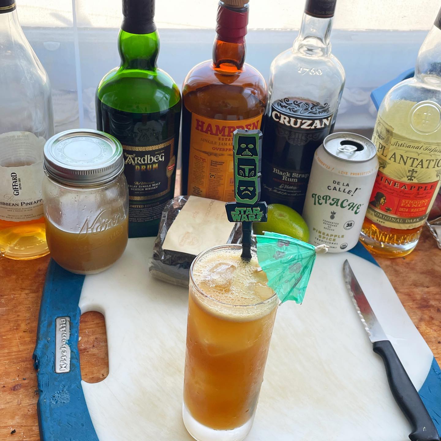 Infusing the aromatic and funky Jamaican Overproof Rum with smoky lapsang souchong tea adds notes of earthiness and smoke to the tropical fruit and caramelized sugar notes in the rum while additions of Blackstrap rum, pineapple rum, and rum barrel-aged Islay Scotch contribute additional molasses notes while boosting the pineapple and smoke notes. The fresh lime juice and pineapple tepache add zip and acidity while complementing the tropical flavors while ginger syrup and a splash of pineapple liqueur add a spicy tropical base note that helps balance the drink. Delicious!