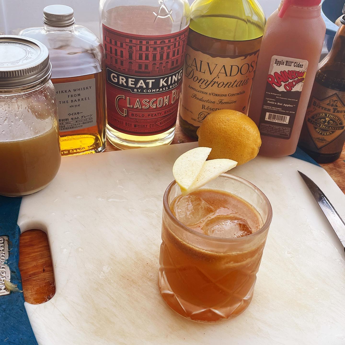 The trio of blended scotch, aged Japanese malt, and apple brandy create a tasty base with notes of orchard fruit, honey, Heather, and subtle smoke that work beautifully with the cider reduction to create a drink with lots of fall flavor. The ginger syrup and Clove-forward bitters add a nice spice punch while the lemon helps add brightness and acidity. Fall harvest season in a glass