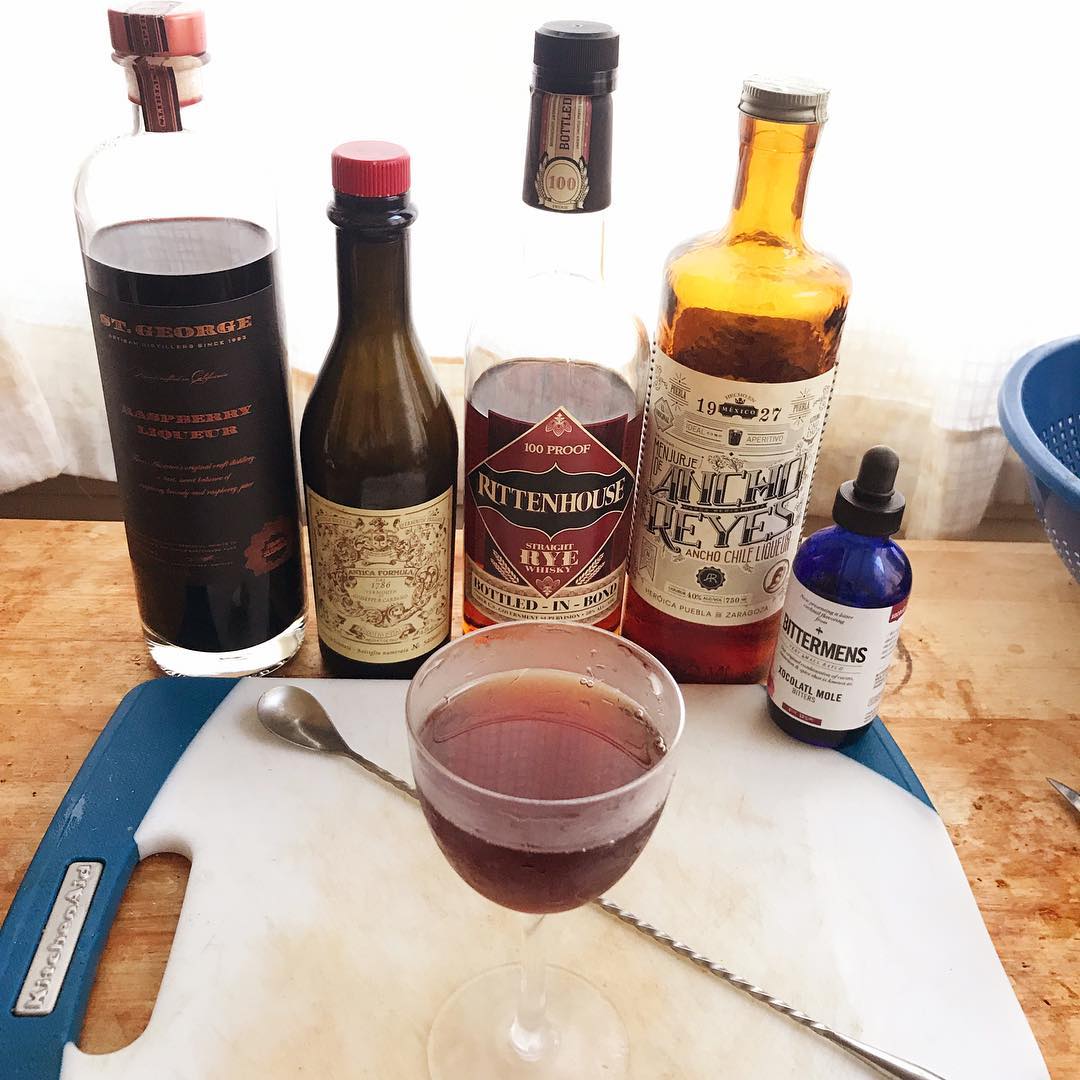 Manhattan variation that adds accents from chili, chocolate, raspberry from the current Death & Co menu