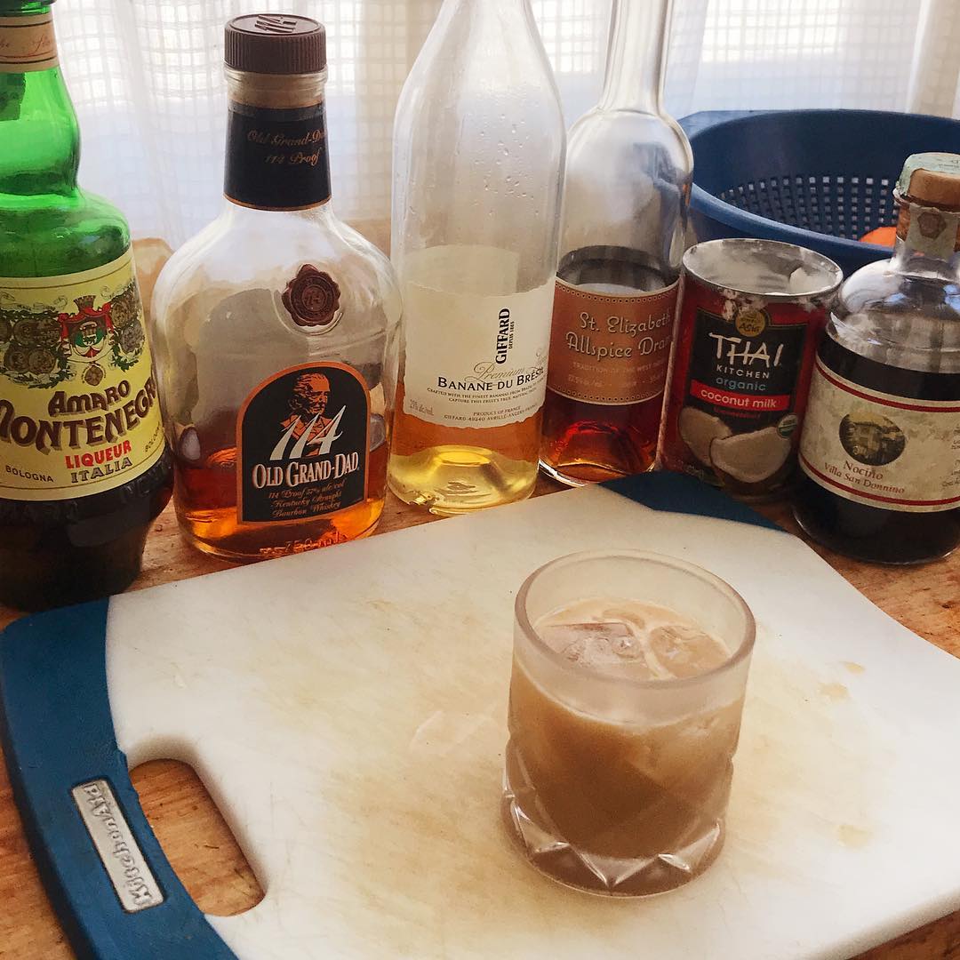 The tropical notes in the coconut cream are boosted by the banana liqueur and allspice and complemented by the oak and cinnamon notes from the overproof bourbon, the bit of walnut liqueur, and bittersweet amaro. Definitely a night cap or substitute for dessert, but very tasty