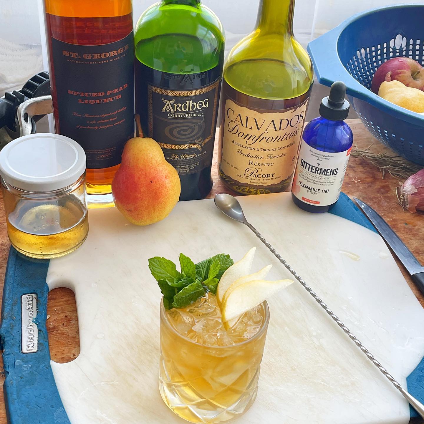 The blend of sherry-barrel finished Islay Scotch and Calvados creates a base with notes of smoke, orchard fruit, and subtle toffee accents that is complemented very well by the baking spice and ripe pear notes from the splashes of spiced pear liqueur and cinnamon syrup. Dashes of Tiki bitters contribute additional ginger and warming spice notes while the mint adds a refreshing aroma to each sip