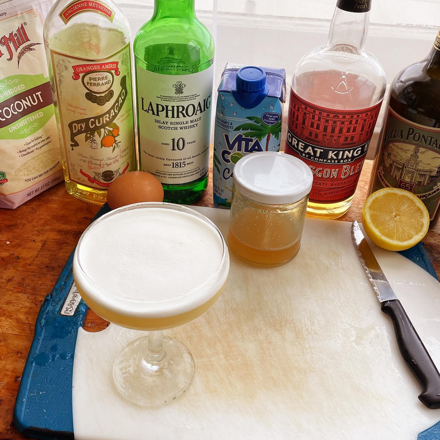 The honey and cereal grain notes in the blended scotch work nicely with the nutty and tropical notes from the toasted coconut syrup while the splash of Orange curaçao adds a hint of citrus peel that works nicely with the bright tart lemon juice and dash of herbal Absinthe to balance the drink. The egg white adds body and froth and the rinse of Islay scotch adds a subtle smoky aroma to each sip