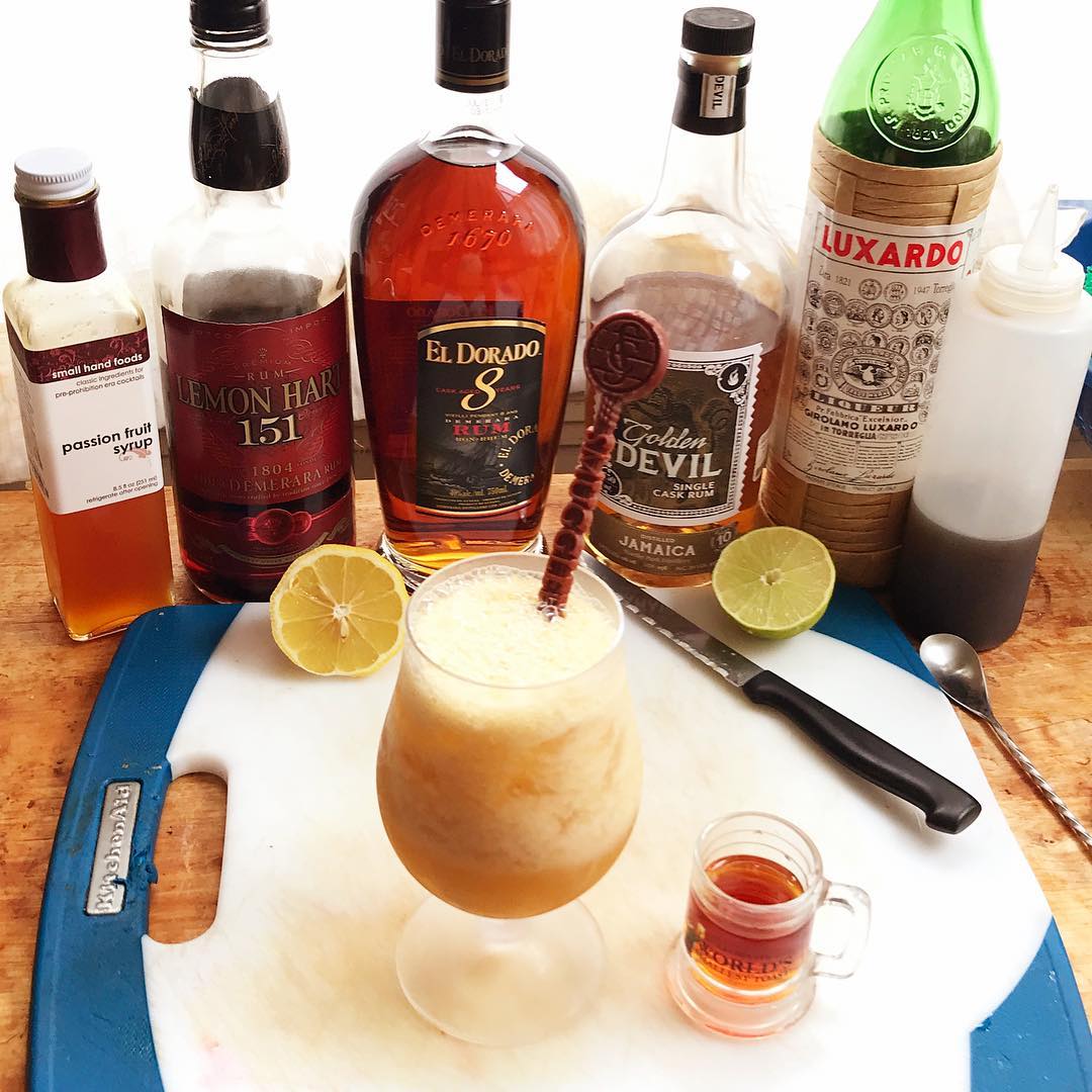 The lime and passion fruit syrup combine to establish a delightful and nuanced tart/sweet base that is brightened by a bit of lemon juice while the molasses and vanilla notes from the rum add body to the drink and the Maraschino liqueur adds a subtly funky, dark fruit note. The side of danger pour of Overproof rum brings necessary oomph