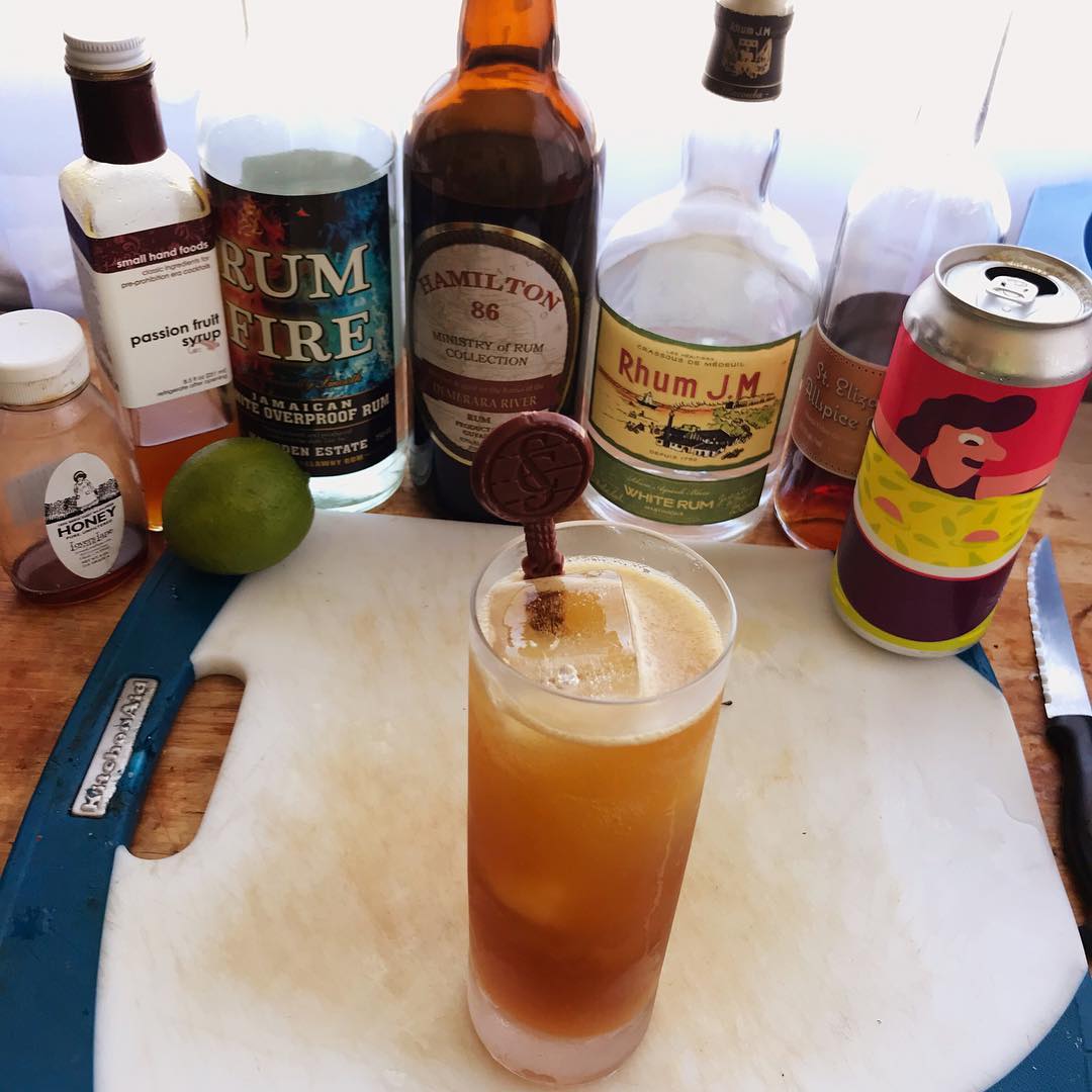 A fun, flavorful Tiki beer cocktail inspired by Shannon Mustipher’s Kill Devyl Reef 🗿🏝 The blend of Demerara, Unaged Agricole, and Overproof Jamaican Rum create a base teaming with notes of funky molasses/sugarcane and tropical fruit. These flavors work very well with the sweet/tart passionfruit in the syrup and Gose style beer and are supplemented by honey, lime, and allspicefor a delicious, yet potent punch