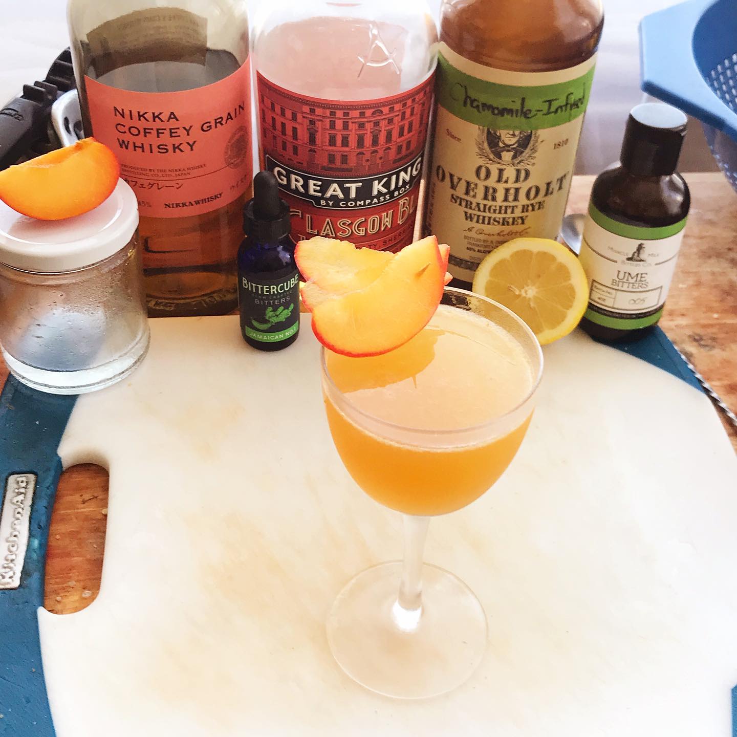 The blended scotch lends flavors of honey, cereal grain, and a whisper of peat that works nicely with the honeyed notes in the muddled pluot. Additions of chamomile-infused rye whiskey and Japanese grain whisky contribute complementary notes of vanilla, chamomile, and spicy grain while the lemon lightens and brightens the drink for summer and the bitters give notes of tartness, ginger, and a bit of the spice cabinet