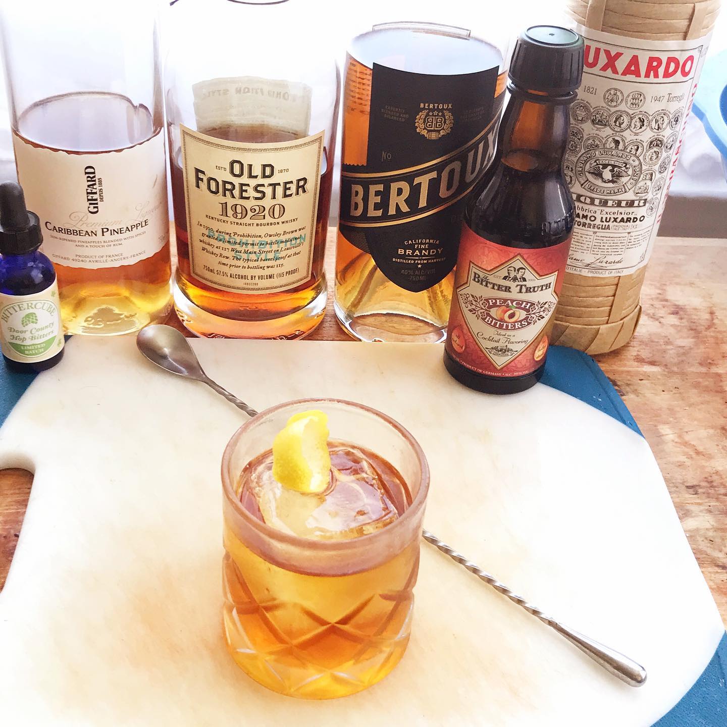 A playful Old-Fashioned riff from Death & Co NYC with some boosted fruit notes 💎🍍🍒 The split base of bourbon and brandy results in some enhanced fruit flavor from the brandy that accents the vanilla/caramel/baking spice notes in the bourbon. The use of a hopped pineapple liqueur (pineapple liqueur with two dashes of Hop Bitters) contributes a tropical aroma with a hint of bitterness from the hop that helps cut the sweetness. The splashes of maraschino liqueur and peach bitters add some additional fruit cocktail notes without making things too sweet