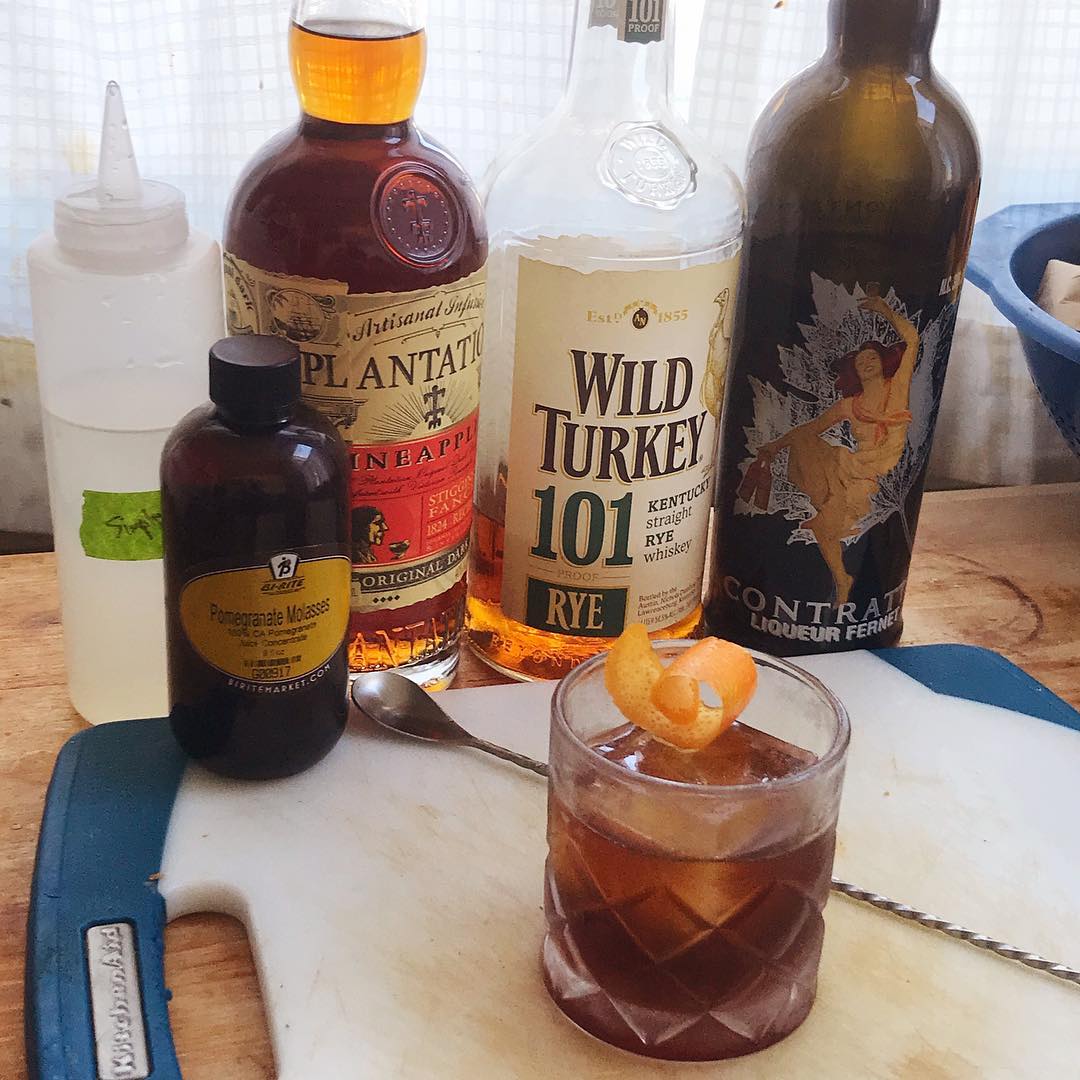 The rye spice, rich sweetness from the pineapple rum, pomegranate tartness, herbal Fernet, and orange oil combine to form the flavors of a really nice panettone or fruit cake