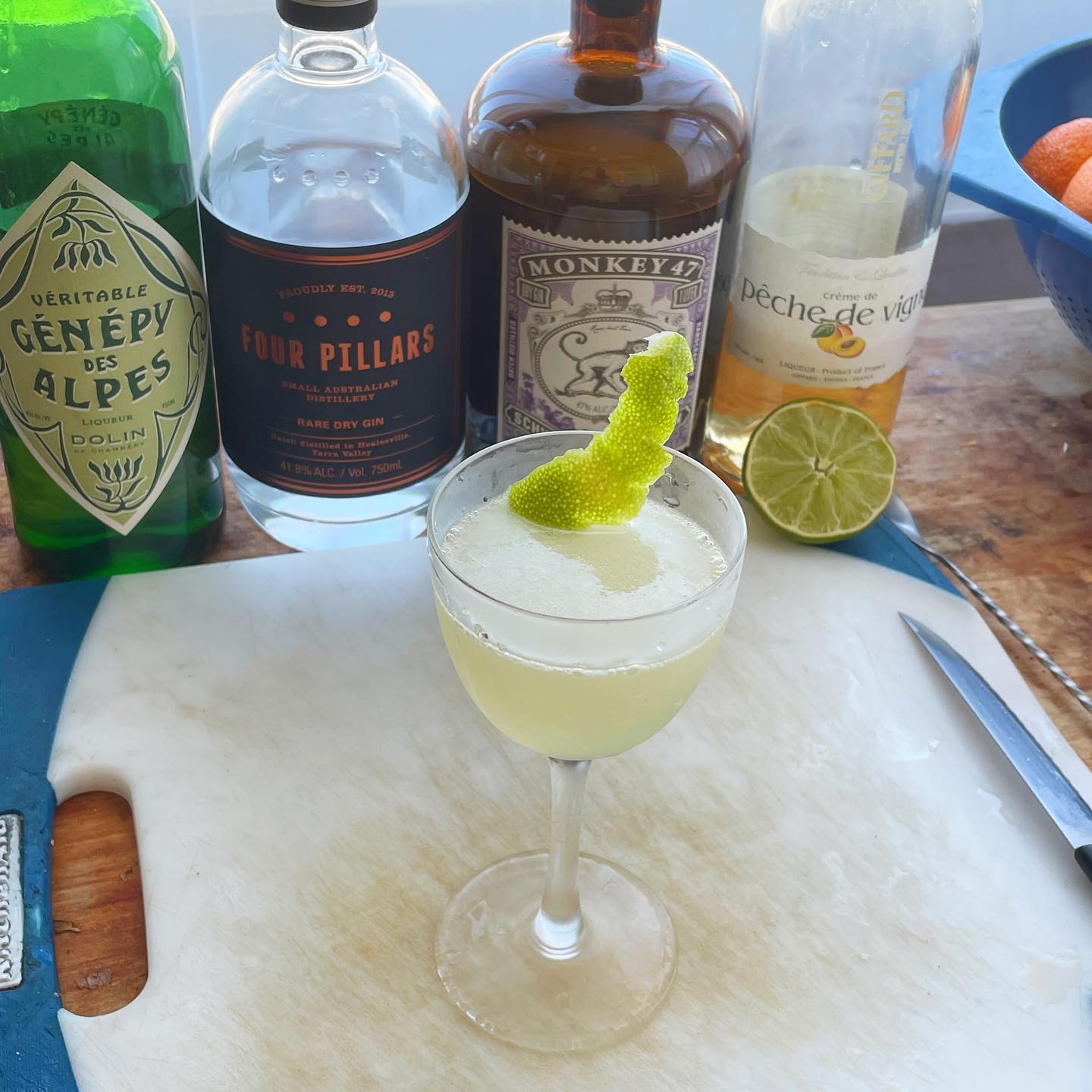 The juniper and other botanical notes in the blend of gins works nicely with the floral and woodsy notes of the Alpine liqueur (Genepy) while the tart lime juice brightens the drink and the peach liqueur helps round off the edges while working harmoniously with the floral accents