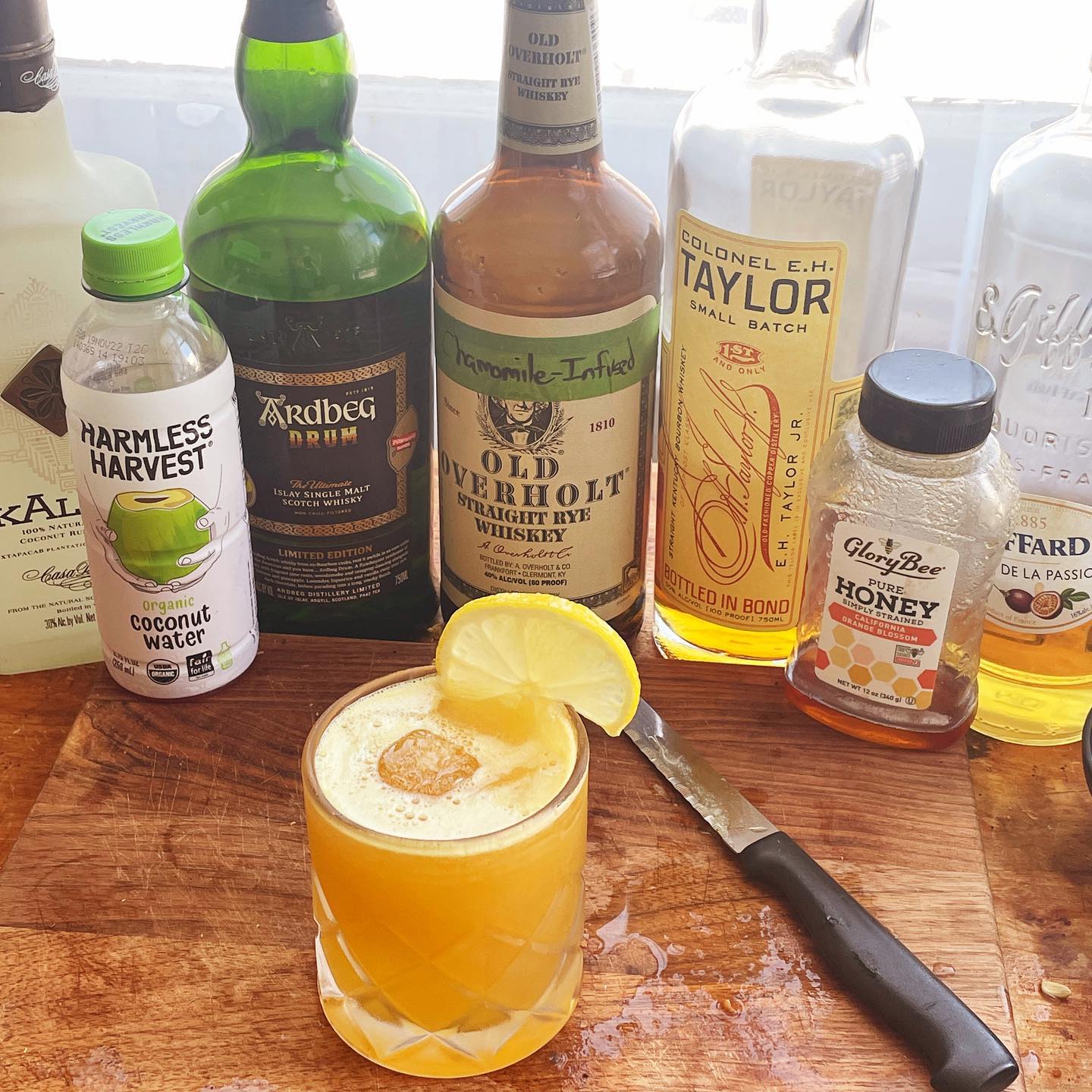 The chamomile tea infusion boosts the dusty and floral notes in the Old Overholt rye whiskey while the bonded bourbon has caramelized sugar and subtle baking spice notes that play nicely with the chamomile and citrus. Fresh lemon juice combines with a splash of passionfruit liqueur to lend a nice tart/fruity finish to each sip. Honey syrup adds body and balance while the coconut water adds refreshment and lengthens the drink. A splash of coconut liqueur boosts the coconut flavors while a float of Islay scotch adds complementary smoke notes while also integrating the coconut and citrus with the other whiskies.