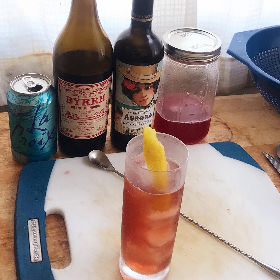 The tart cranberry and bittersweet byrrh add interesting accents to the dry, nutty sherry while the lemon peel and soda water lighten and brighten the drink