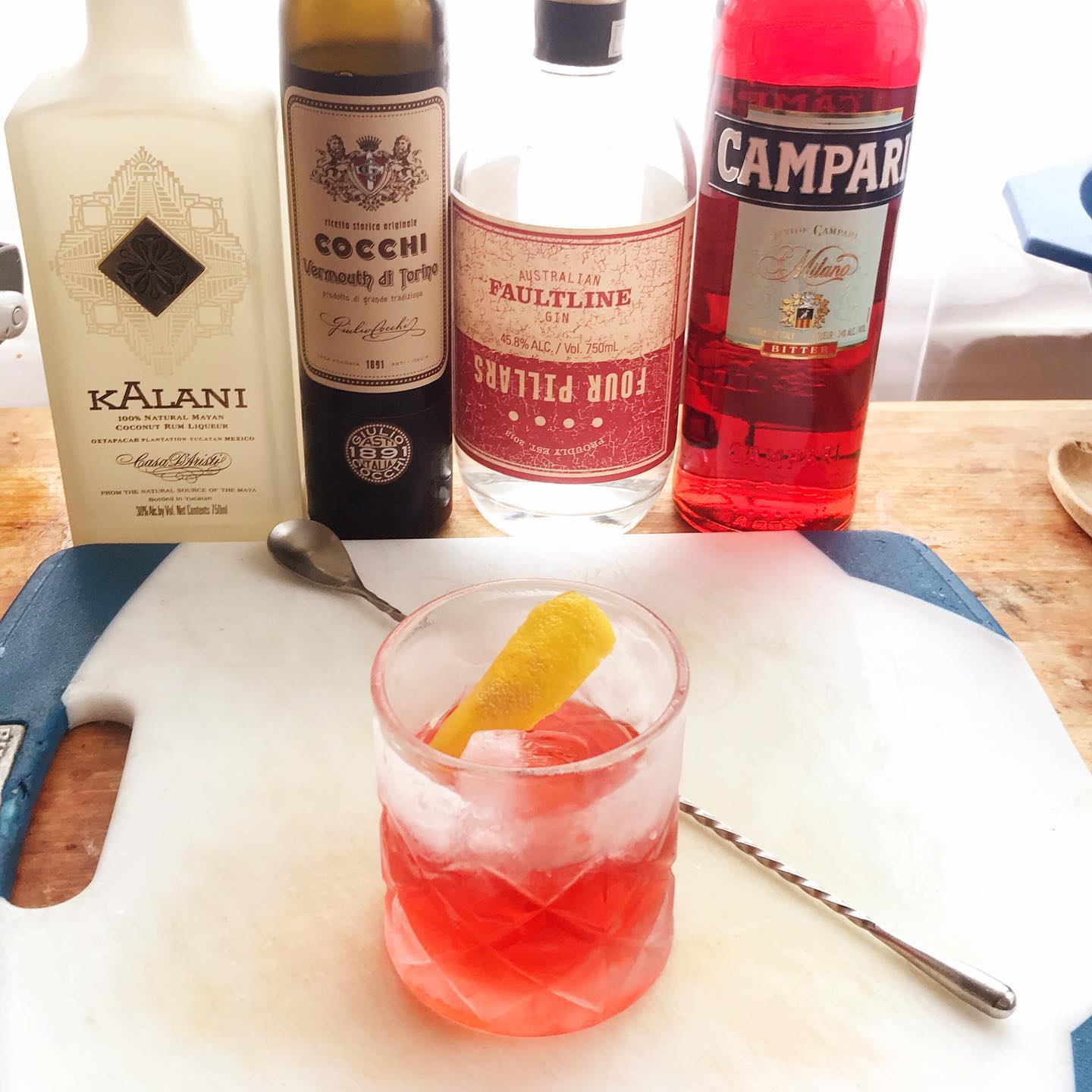 A bittersweet, yet tropical Negroni riff from talented NYC bartender Sarah Morrissey that brings a bit of coconut to Aperitivo hour 🥥🥃 The traditional bittersweet, yet juicy notes of the Campari work with the juniper spices in the gin to create a flavorful base that is rounded out by the cocoa and spice notes from the sweet vermouth and complemented beautifully by the hint of coconut from the liqueur. Great to start or end a meal!