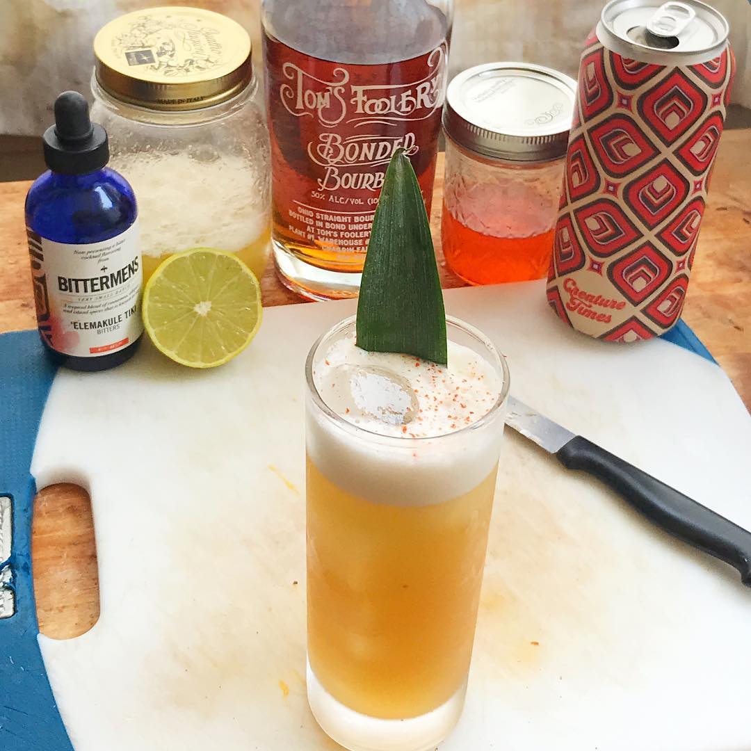 The cinnamon notes in the bourbon lend spice and oomph to the pineapple and lime while the Wild Ale adds tartness and funk (while boosting the pineapple and lime notes) and the Li Hing Mui syrup adds savory and sweet notes