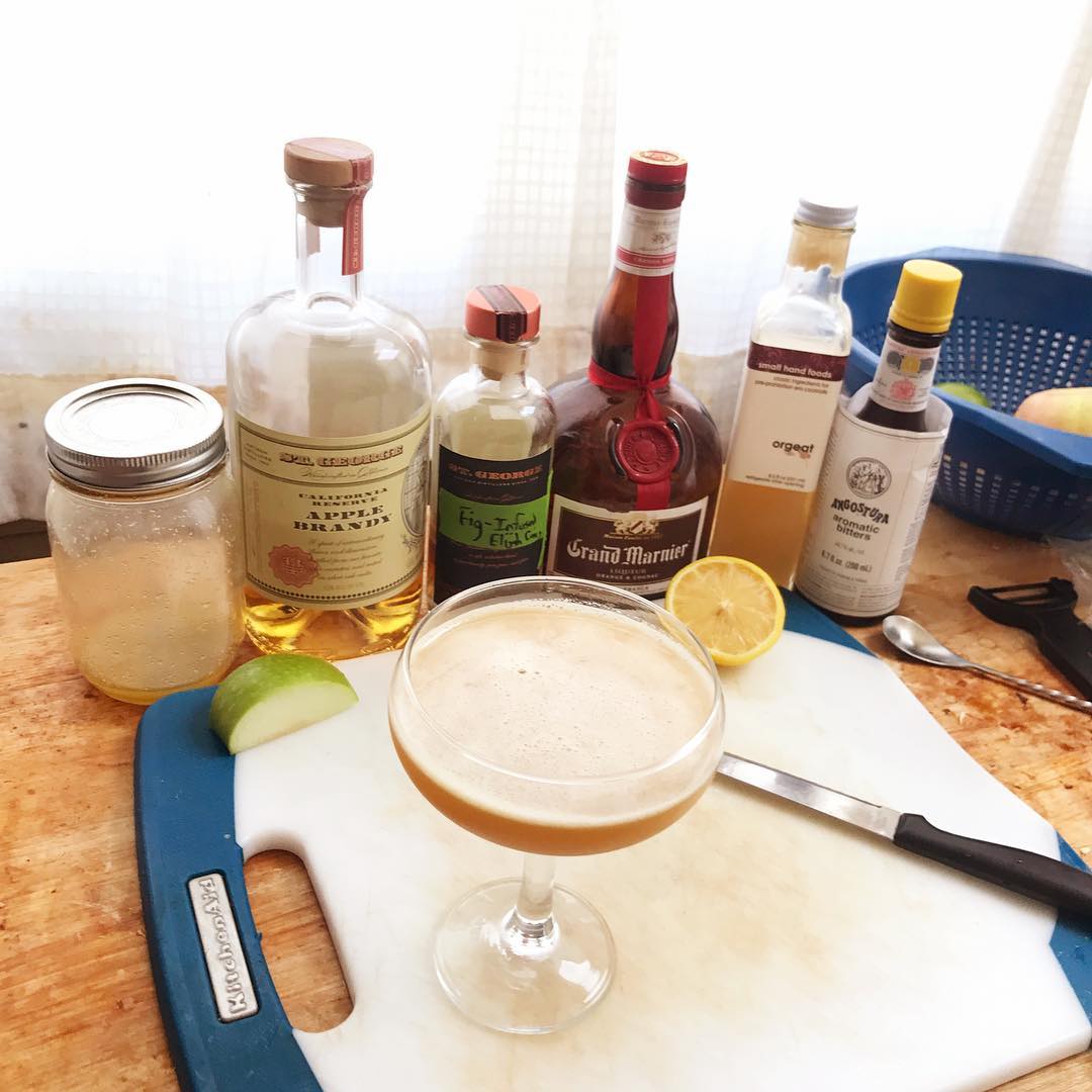 The fig-infusion pairs very well with the vanilla and baking spices from the bourbon, the dry apple brandy complements the Granny Smith juice to lend an apple flavor that is not too sweet, and the ginger syrup provides a spicy bite