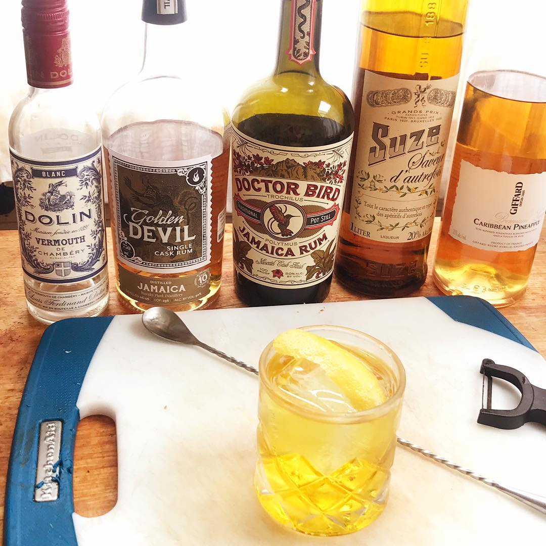 The Suze brings its characteristic gentian-forward bitterness and striking yellow color which is lightened by the bit of pineapple liqueur and the subtle sweet with a touch of chamomile Blanc vermouth. Meanwhile the blend of aromatic Jamaican rums add tropical notes and oomph
