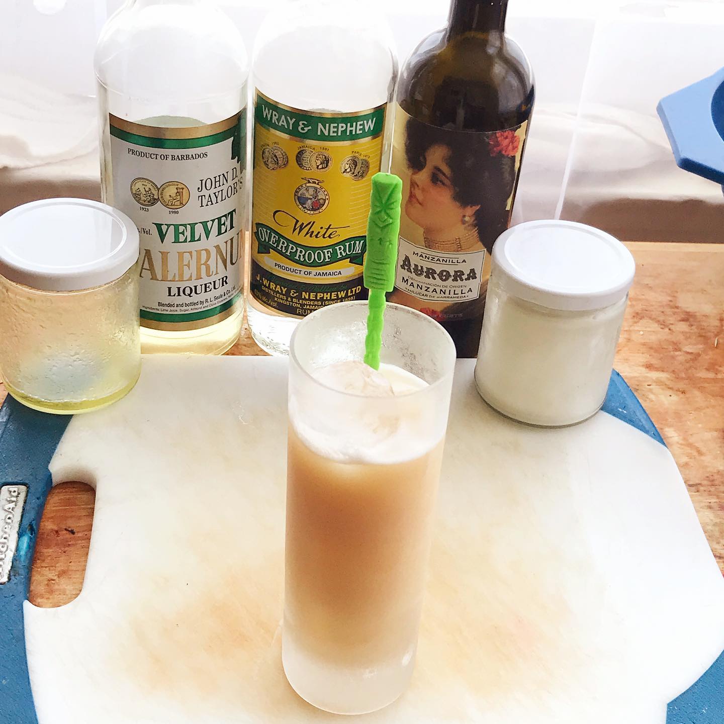 The Overproof Jamaican rum and manzanilla sherry dry out/reduce the sweetness from the tropical fruit bomb of the pineapple juice and coconut cream while the Falernum contributes notes of baking spice and lime zest
