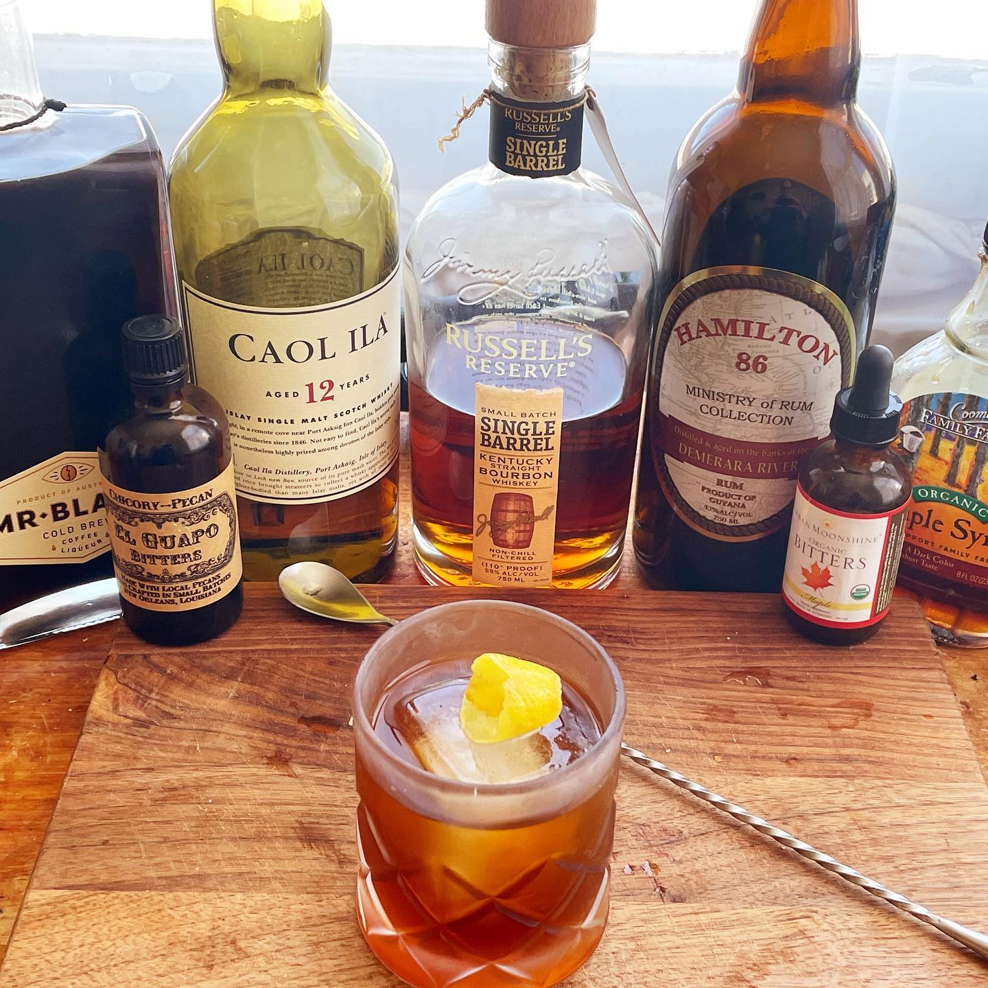 The blend of cask strength bourbon, aged Demerara rum, and Islay scotch form a flavorful and high octane base with notes of caramelized sugar, molasses, honey, and subtle nutty and smoky flavors that help highlight the coffee (liqueur and bitters) and maple (syrup and bitters) additions to the drink. A lemon twist adds a bit of pleasant, citrus-forward essential oils that add a bit of freshness to each sip
