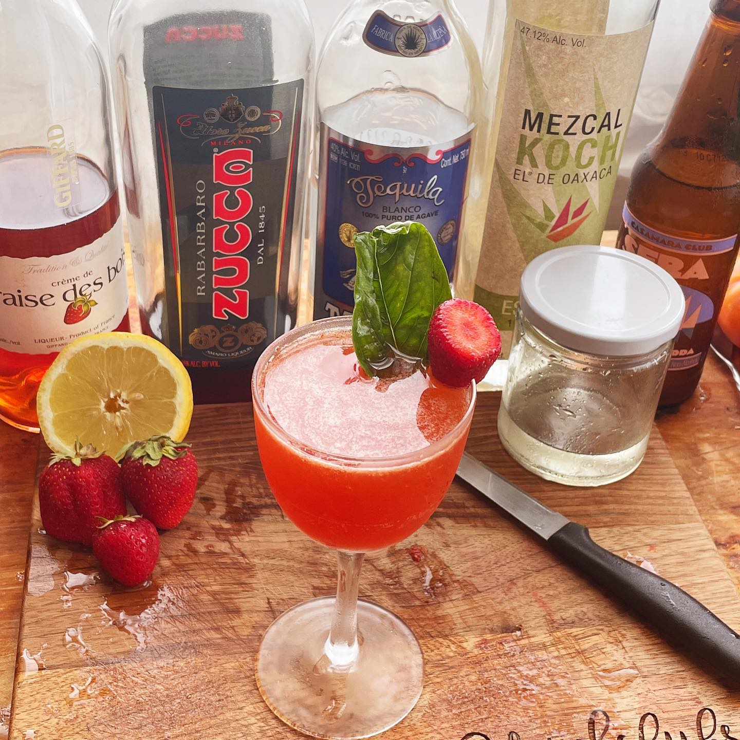 The blend of unaged tequila and mezcal results in a base with notes of citrus zest, pepper, and a touch of smoke that complement the sweet flavors from the ripe strawberry, the earthy and bittersweet notes in the rhubarb amaro, and the bright citrus. Splashes of strawberry liqueur and simple syrup help boost the berry flavors and balance the drink while a splash of Amaro soda helps lengthen the drink and add effervescence and the sprig of fresh basil adds a pleasant aroma with each sip