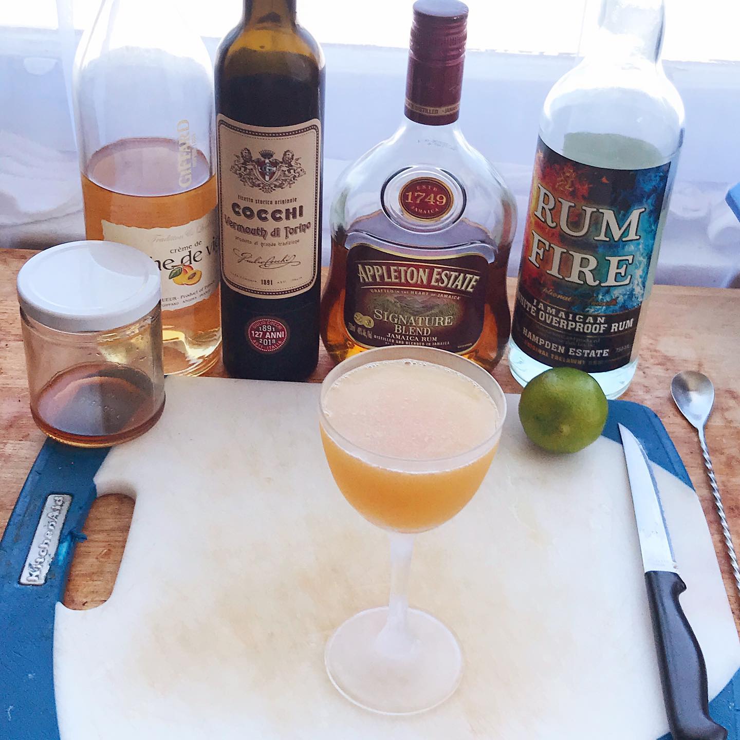 A funky slightly unorthodox Tiki-fied Sour/Daiquiri originally uncovered by Ted Saucier and updated by Chicago drink whiz Paul McGee 🍑🏝 The funky, tropical Jamaican Overproof Rum works very nicely with the stone fruit flavor from the peach liqueur while the Jamaican Lightly Aged Blended Rum adds notes of molasses and caramel that work nicely with the bits of Sweet Vermouth and rich simple syrup and the lime brightens and lightens the drink. A nice, refreshing drink to enjoy at the end of the work week .75 oz Jamaican Overproof Rum (Rum Fire, Hampden Estate Overproof, etc)