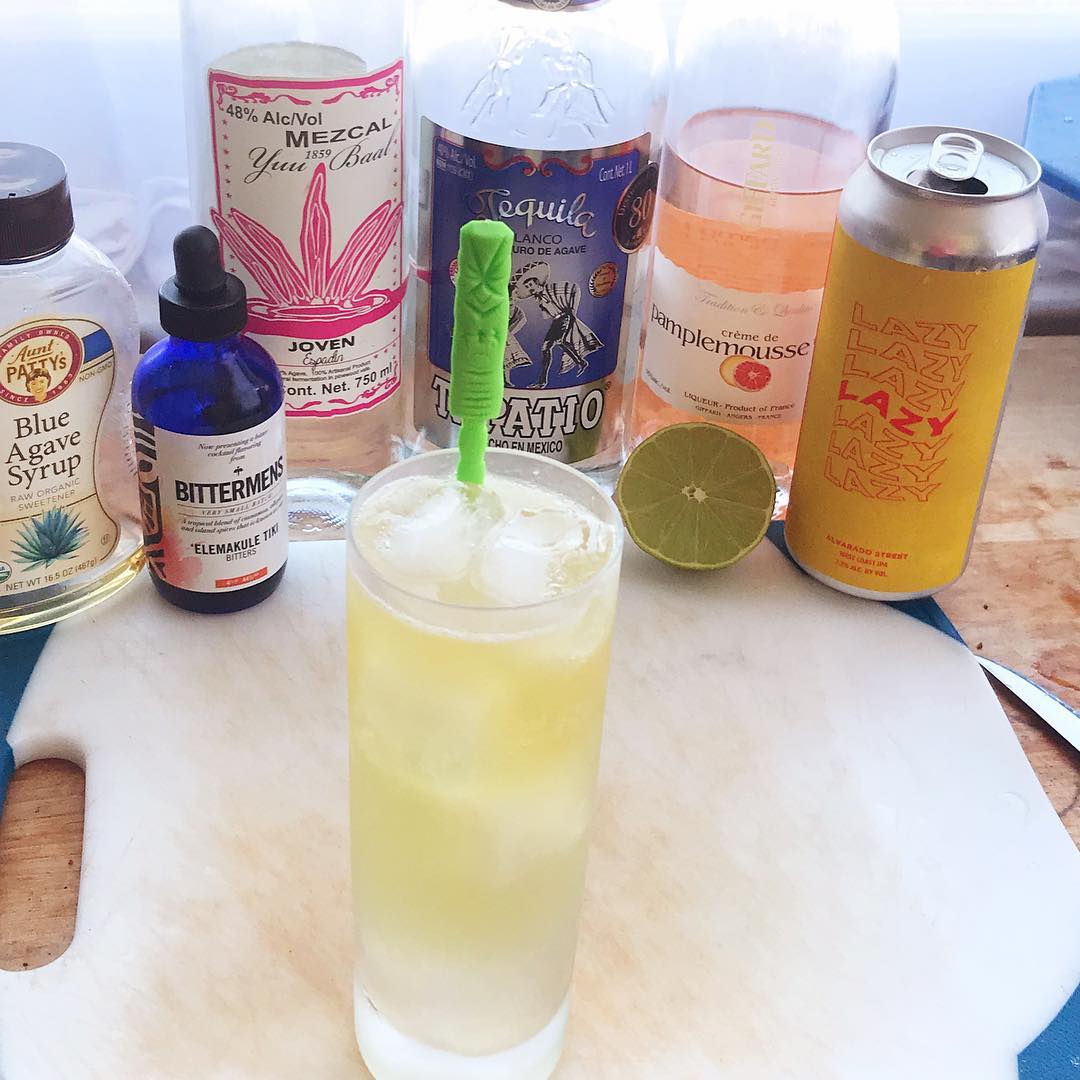 The tropical and slightly vegetal notes in the blanco tequila and smoke notes in the mezcal provide a flavorful base that complements the citrus flavors while the grapefruit notes of the Simcoe hops in the West Coast IPA accents all flavors nicely while also contributing great aroma and nice effervescence and the Tiki bitters add a hint of ginger and cinnamon