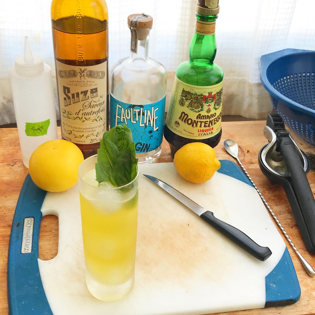 The tart notes in the grapefruit are amplified by the bittersweet notes in the Italian amaro and French gentian root liqueur and mesh very well with the citrus peel and juniper notes in the gin and lemon while the basil provides a nice aroma