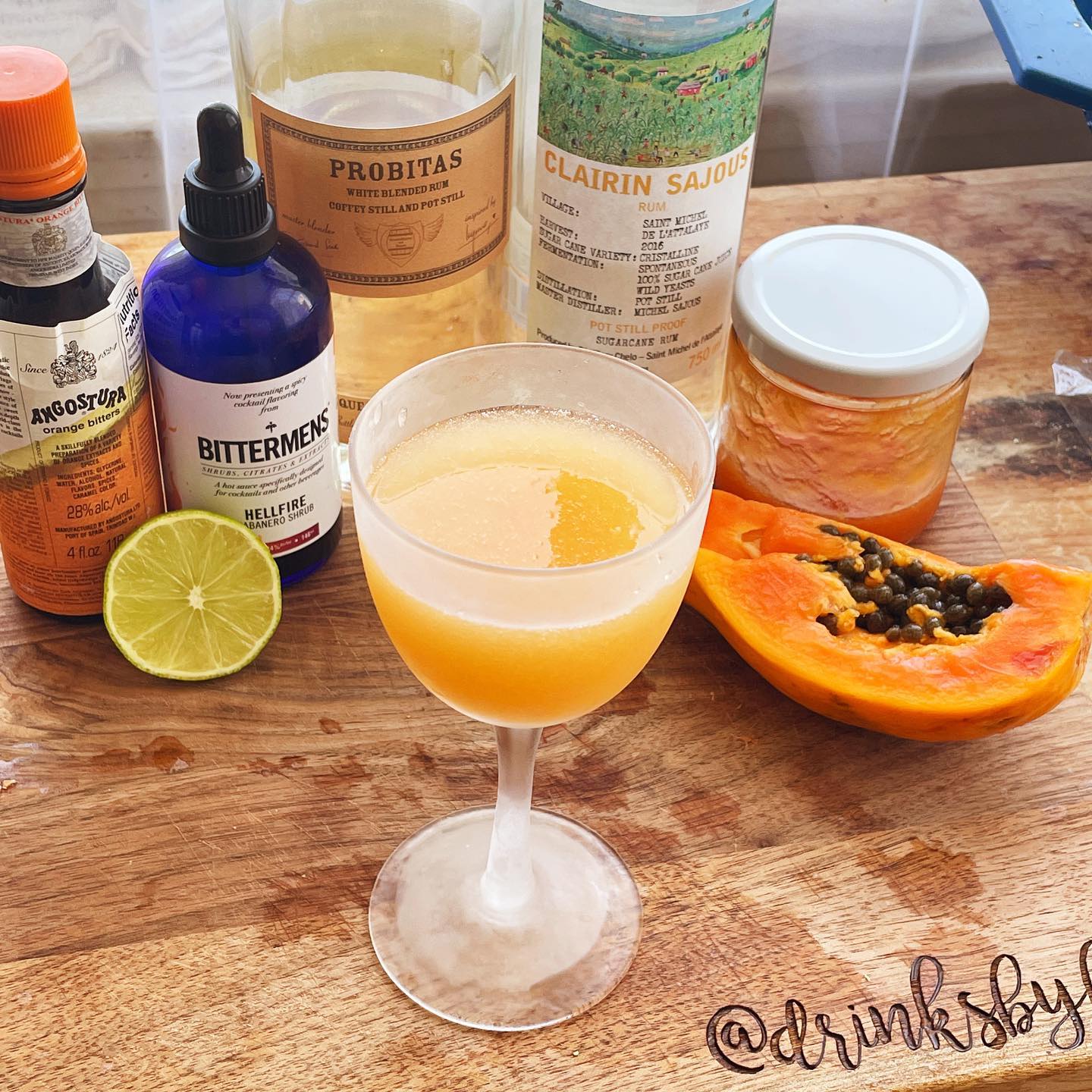 The blended lightly aged rum and Haitian sugarcane rhum (Clairin) form a base that has a lightly funky grassiness that combines with the tropical, slightly floral papaya and bright, tart lime juice that is layered and full of flavor. Dashes of orange bitters and habanero shrub add a touch of fruity heat to finish each sip