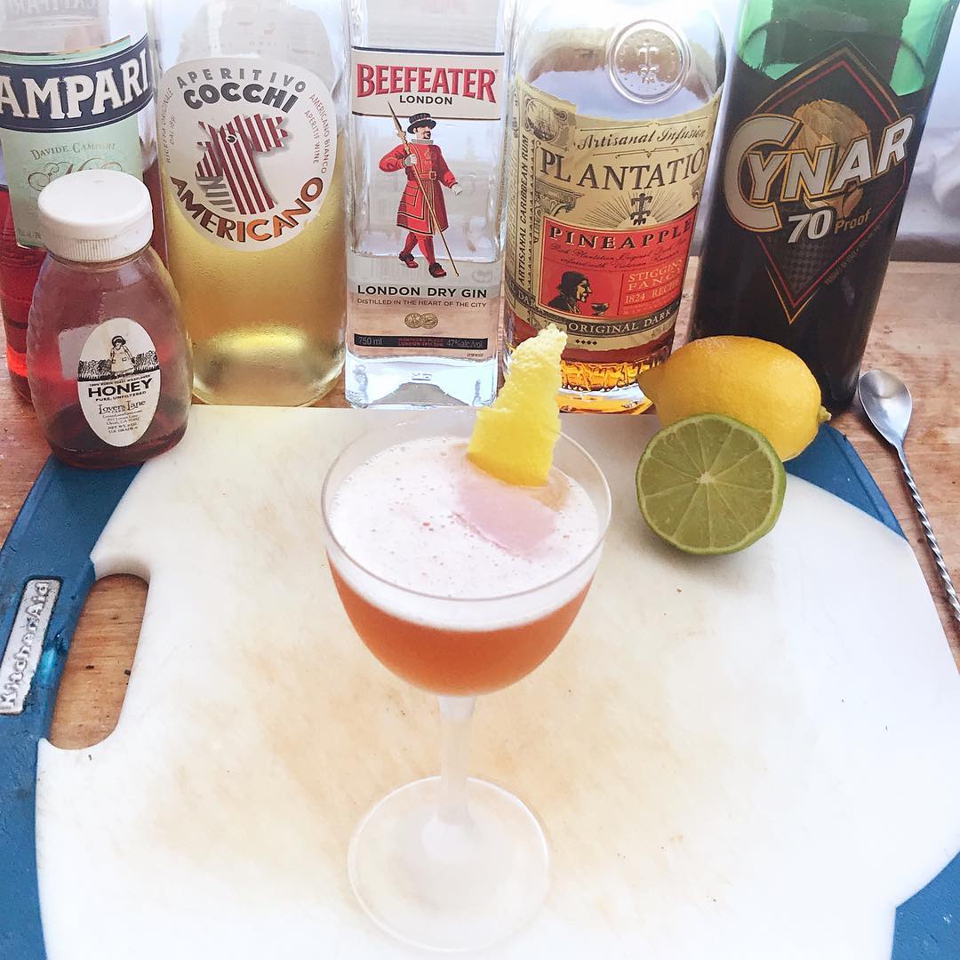 The pineapple rum echoes the fruit notes from the apricot brandy in the original and it’s flavor marries better with the juniper and other spices in the gin. The use of the aperitif blend mellows the gin and echoes the citrus notes of the lime and lemon while allowing you to keep the drink more balanced and less acidic. The bit of honey syrup adds body that came from the egg white in the original while also adding a touch of deep sweetness .75 oz London Dry Gin (Beefeater, Tanqueray, etc)