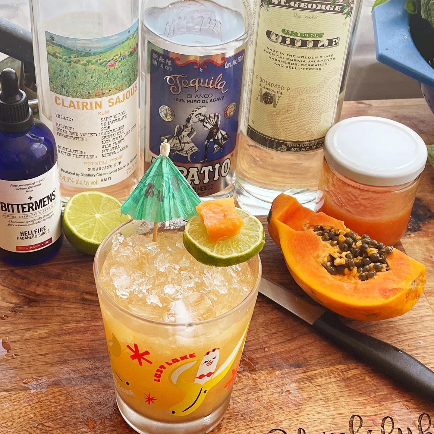 The citrus zest and green pepper notes in the unaged blanco tequila combine with the cilantro and green chile notes in the infused vodka to form a savory, citrusy base while a splash of Haitian sugarcane rhum adds a touch of grassy funk that helps bridge these flavors with the floral papaya syrup. Fresh lime juice helps add brightness and acidity while the habanero shrub adds a touch of fruity spice. A great warm weather sip!