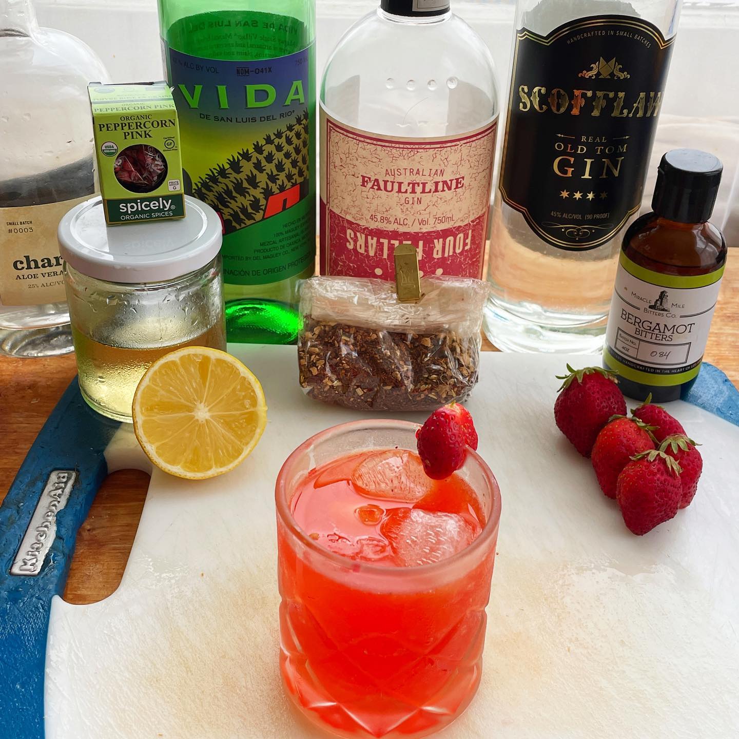 The spice and tannic notes in the Rooibos tea-infused gin work nicely with the muddled fresh strawberries and the bright lemon flavor. Adding smaller volumes of Old Tom gin and mezcal add notes of smoke/citrus zest while also rounding out the flavors. The pink peppercorn syrup adds a fruit-forward bit of complementary spice while a splash of aloe liqueur adds a hint of vegetal flavor that works to bridge the gin and strawberry and the dash of Bergamot bitters helps emphasize the tea and citrus notes in the drink