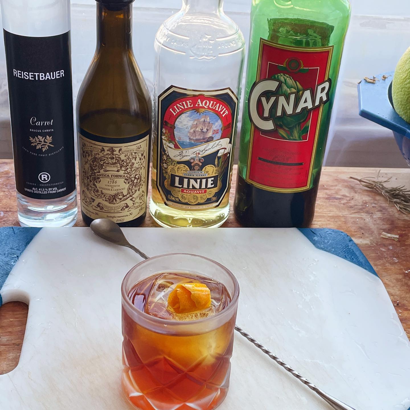 The caraway notes in the aged Aquavit act as a great counterpoint to the carrot eau de vie while the bittersweet notes from the Cynar and cocoa/spice notes of the sweet vermouth help harmonize all of the flavors. A delicious pre-dinner sipper!