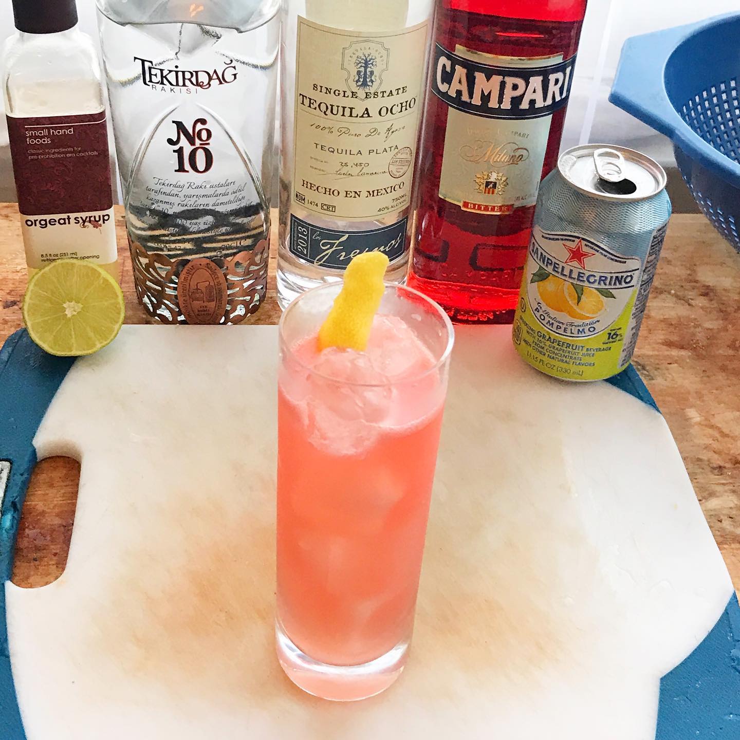 The vegetal and citrus notes of the Blanco tequila work nicely with the tart lime juice, and grapefruit soda to provide the framework of a more traditional Paloma. The bittersweet Campari boosts the grapefruit flavor while the Orgeat adds a slightly nutty sweetness that rounds out the harsher edges. The splash of Raki/Arak adds a pleasing complementary note of anise and also, along with the essential oils from the lemon twist, boosts the aroma