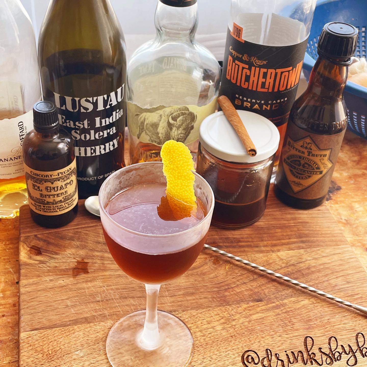 The bourbon and overproof brandy contribute notes of caramelized sugar, vanilla, and a touch of baking spice that act as a rock solid platform for the banana and toffee flavors from the liqueur and Solera-style sherry. A splash of cinnamon bark syrup and a few dashes of bitters boost the notes of baking spice and nuts while adding a subtle undertone of bitter coffee