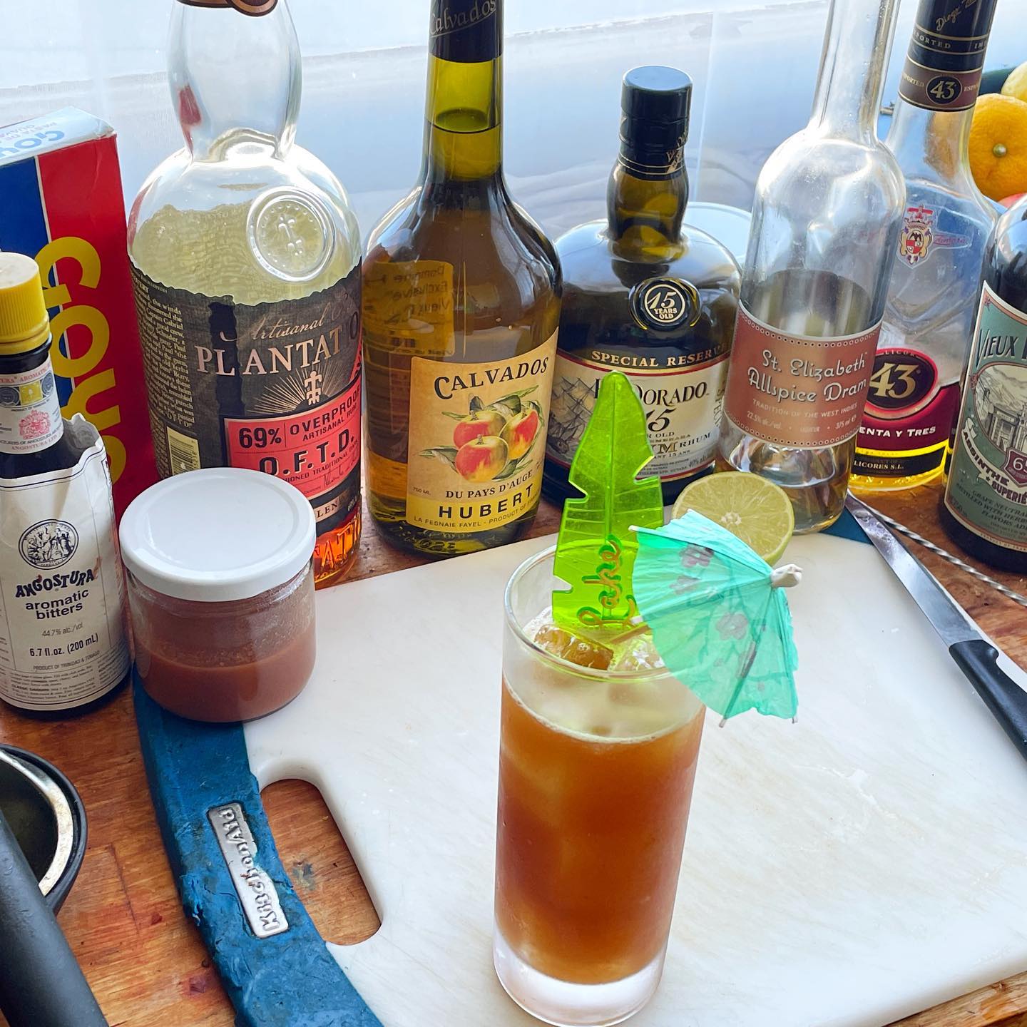 The blend of aged apple brandy (Calvados) with both aged Demerara and Overproof Dark Rums creates a base with notes of ripe apples and brown sugar. The tropical apple/pear notes of the guava works really nicely with these flavors while some fresh lime juice adds some zip and balancing acidity and small amounts of Allspice liqueur, vanilla syrup, Absinthe, and Angostura add complementary herbal and spice notes that bridge all of the flavors