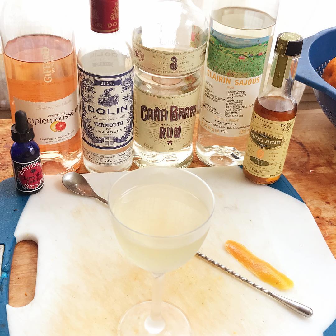 The use of grapefruit liqueur and lime bitters adds a juicy, tart note to the drink without the citrus while the sturdy blended lightly aged rum base is enhanced by the grassy funk of the Haitian clairin and cherry vanilla bitters