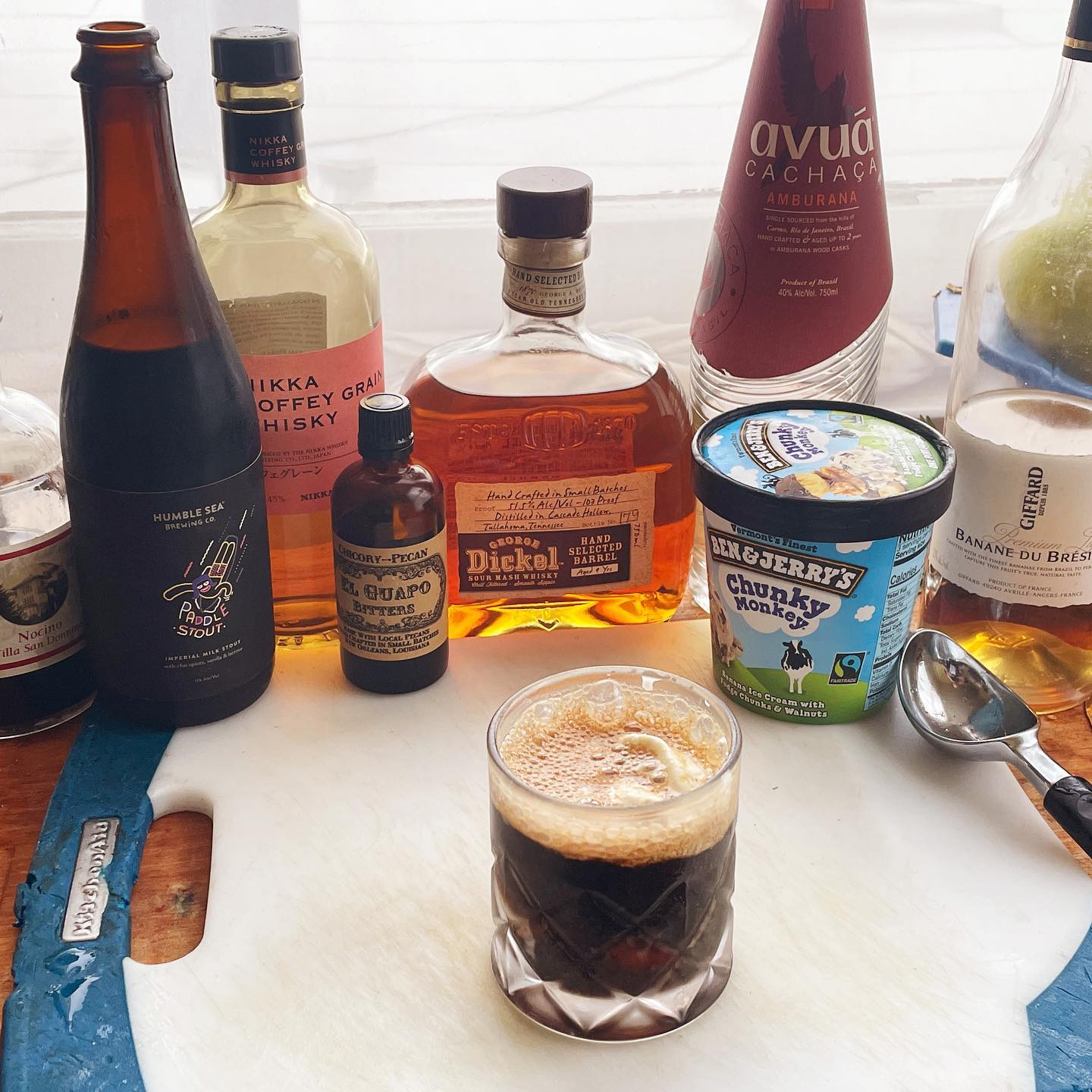 The blend of aged Tennessee whiskey, grain whisky, and Cachaca forms a base with notes of baking spice, caramel, vanilla custard, and tropical fruit that highlights the banana flavors in the scoop of Chunky Monkey (or other banana chip) ice cream. Splashes of Italian walnut (Nocino) and banana liqueurs help boost the banana and walnut notes. The imperial milk stout contributes notes of chocolate and chai spice that helps cut through the richness while the chicory/pecan bitters boost the nutty and dark chocolate notes. A superior dessert drink!