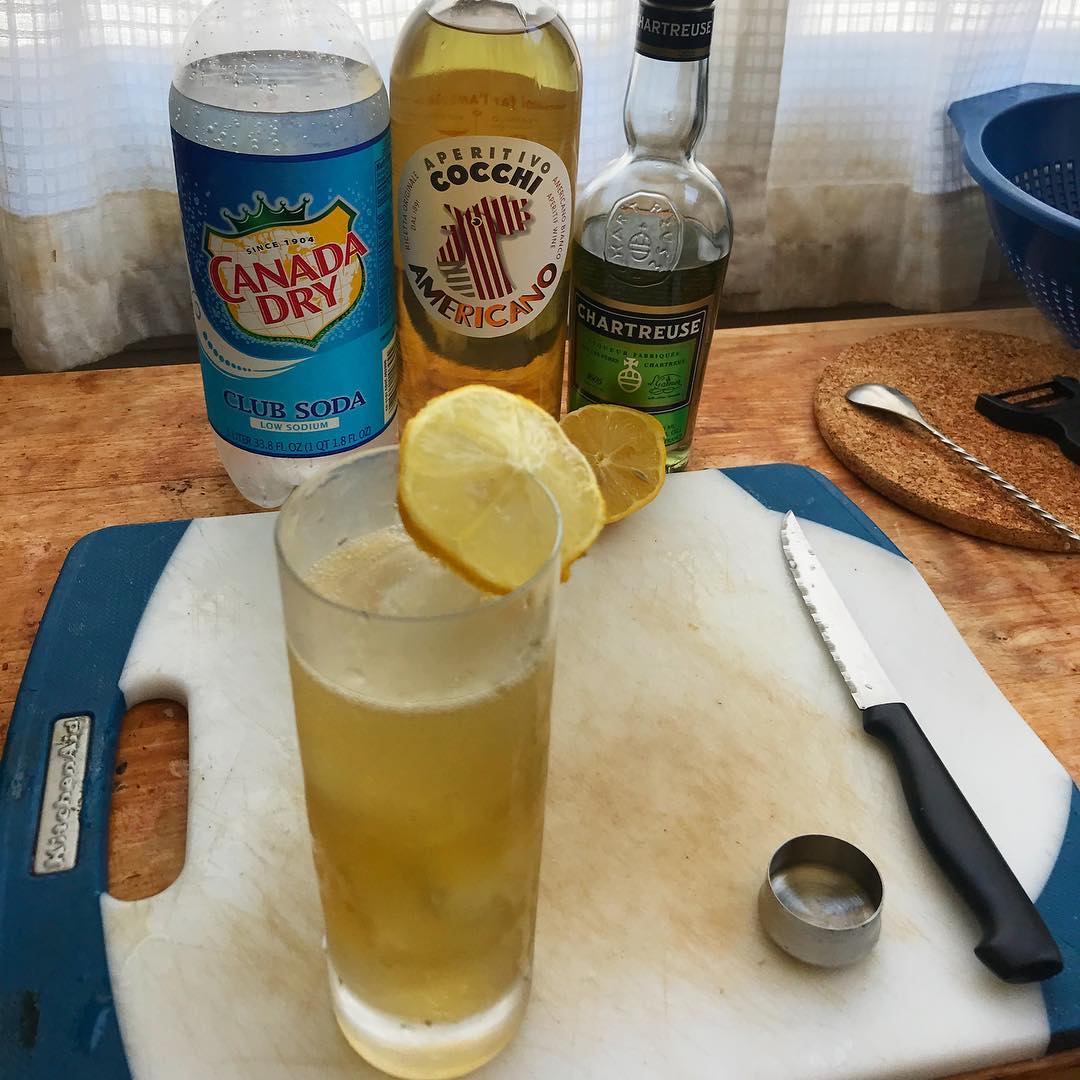 The citrus peel and subtle spice notes in the aperitif white wine provides a nice base for the complex, herbal sweetness of the Green Chartreuse and the tart citrus while the soda water gives effervescence