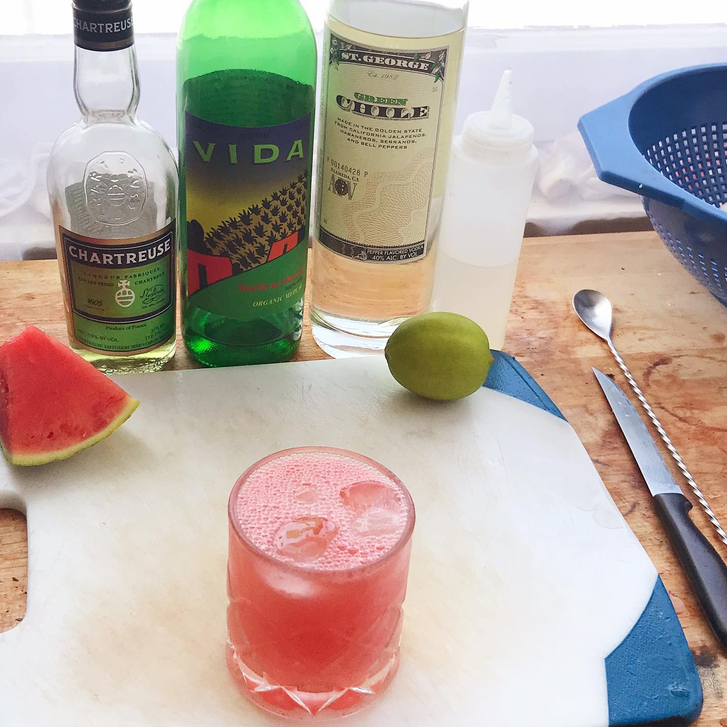 A thirst-quenching summertime punch from NYC’s Shannon Tebay Sidle that brings some layered flavors 🍉🌶 The refreshing, cooling watermelon and lime juice combination are taken in interesting directions with the smoke and subtle tropical fruit notes in the mezcal, a bit of herbal green chartreuse and the clean, vegetal green chiles (jalapeño, poblano, serrano) in the vodka. Great for a poolside afternoon or an outdoor barbecue (also scales up nicely for a batched punch)