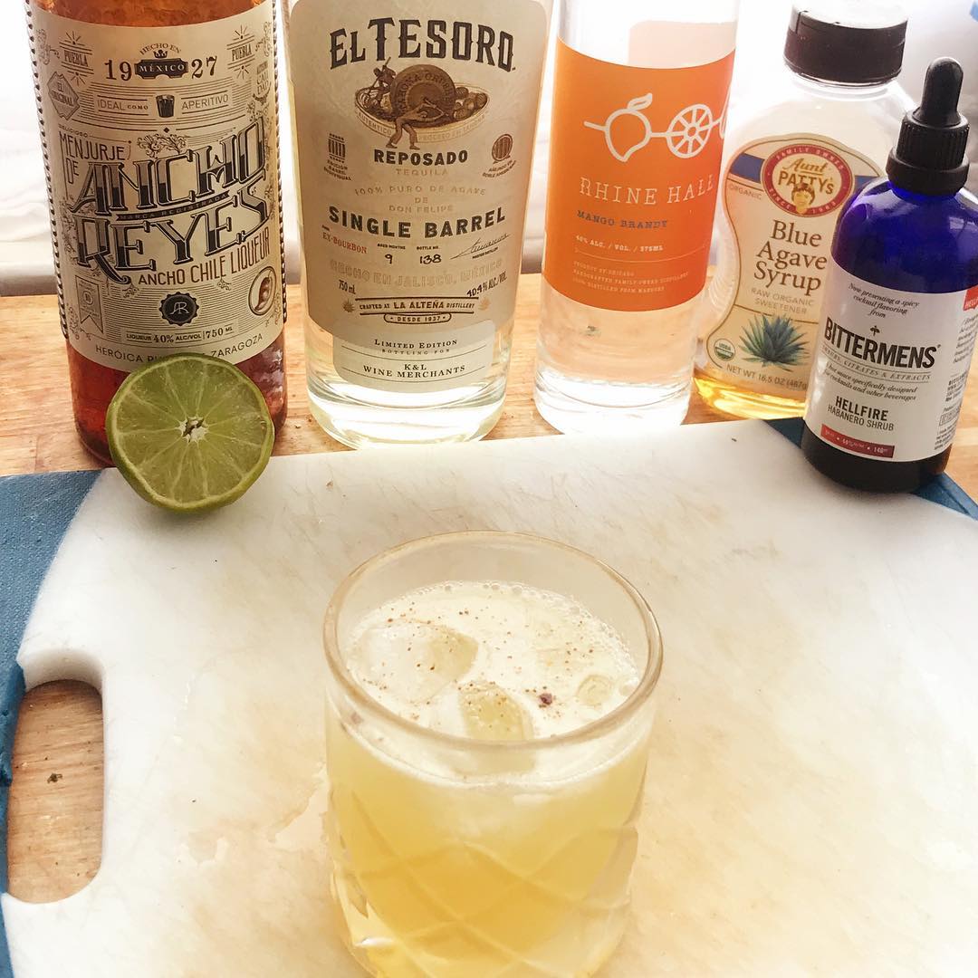 A margarita riff inspired by the flavors one would find at a SoCal fruit cart ðŸ¥ðŸŒ¶ The Reposado tequila has notes of baking spice and butterscotch that act as a complementary background foil to the mango flavors in the brandy, the tart lime, and the chili spice of the Ancho Liqueur and habanero bitters