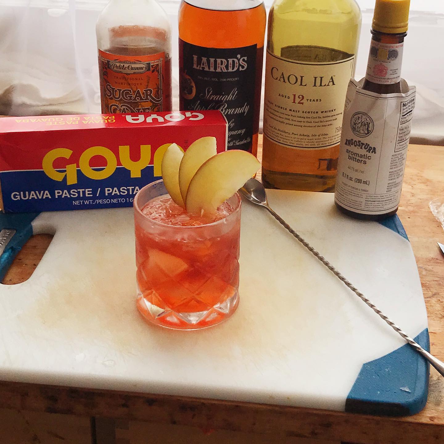 Infusing the relatively dry bonded apple brandy with guava paste boosts the fruit/apple flavor of the brandy while giving a hint of the tropical guava. The addition of a bit of Single Malt Islay Scotch adds rich hints of sherry and a whisper of smoke at the end while the Angostura adds some baking spice notes and the bit of cane syrup adds a rich sweetness that gives the drink body