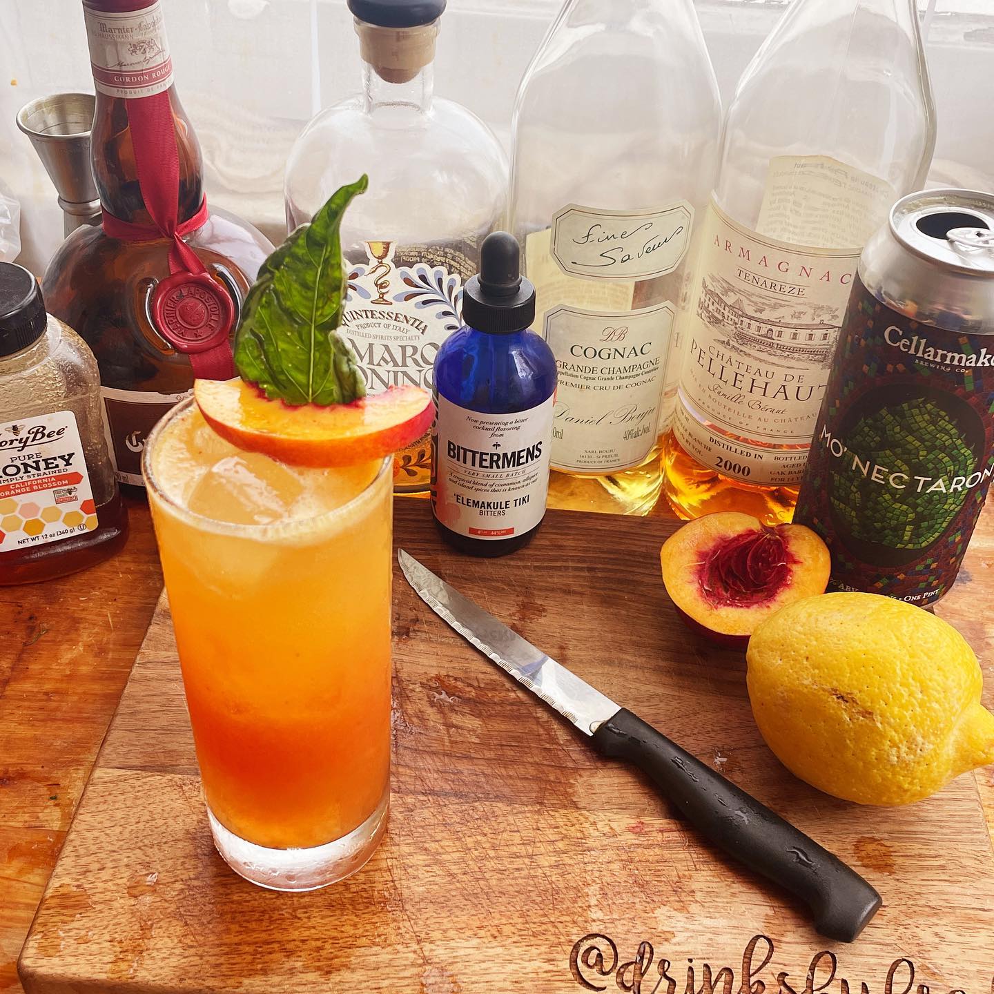 The grape and fresh fruit notes in the blend of Cognac and Armagnac work nicely with the stonefruit notes in the fresh nectarine and in the Nectaron hops in the beer. Fresh lemon juice, the IPA, and the bittersweet notes in the grappa-based Amaro help lend acidic zip and a bitter undertone while the honey syrup and splash of Grand Marnier add some body and sweetness that balance the drink and highlight the fruit notes. A dash of Tiki bitters adds some complementary ginger and baking spice notes and the sprig of fresh basil gives a pleasant herbal fragrance to each sip