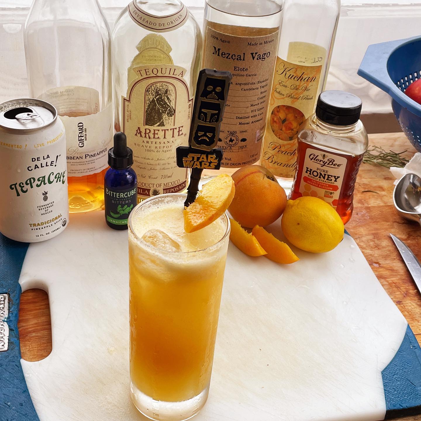 The barrel spice, citrus zest, and slight butterscotch notes in the reposado tequila combine with the rounded roasted corn and smoke notes in the elote mezcal to create a base that highlights the juicy, sweet flavors of ripe yellow peach. The addition of peach eau de vie helps boost the peach flavor which is joined by flavors of pineapple from the tepache and splash of pineapple liqueur. The honey syrup and ginger/allspice notes in the bitters help balance the drink in contrast to the tartness in the lemon and tepache. Summer refreshment at its finest!