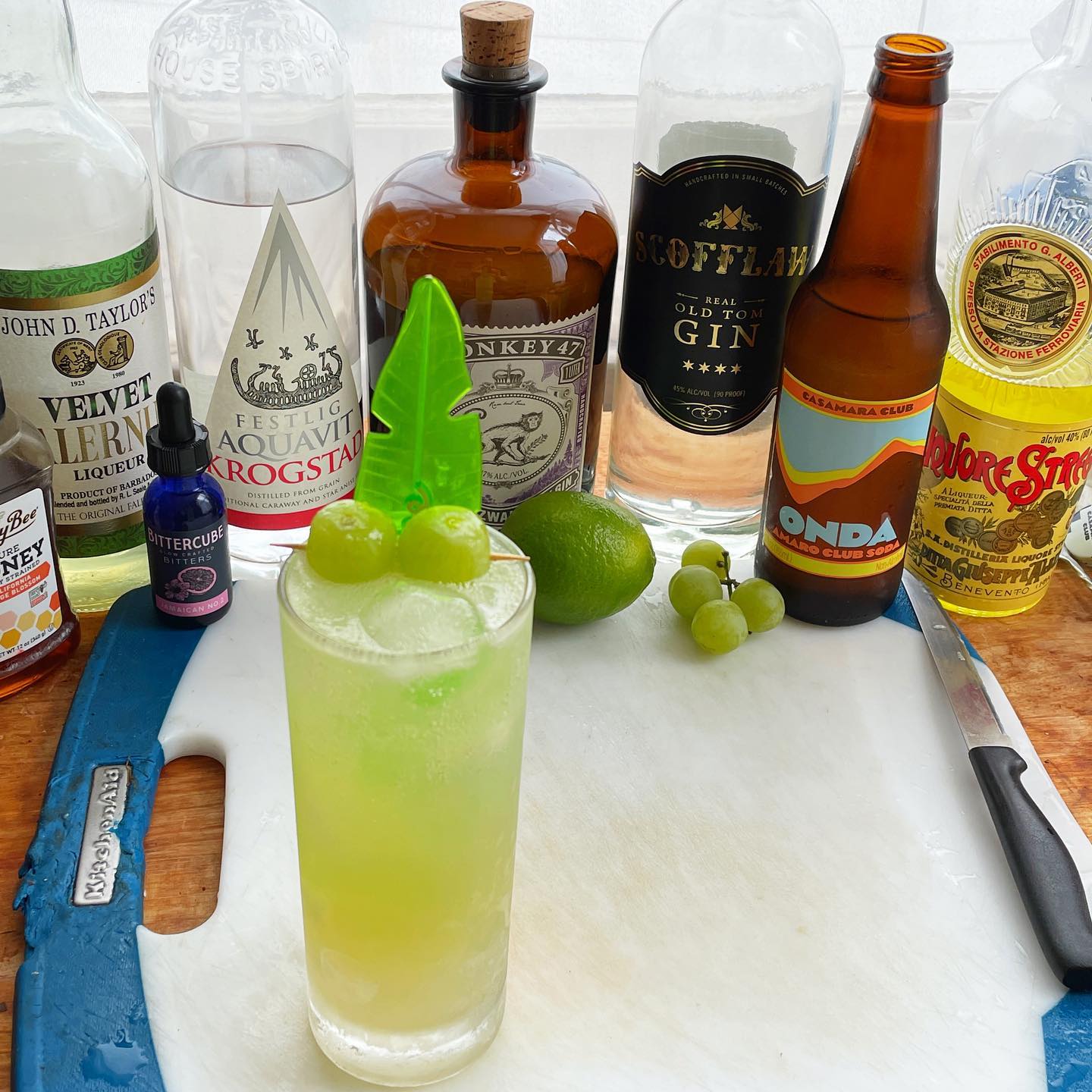Shake with ice and strain into a chilled Collins glass with ice cubes. Top with 1.5 oz of Amaro soda (Casamara Club; the Onda option with sage and star anise is really nice here). Garnish with green grapes on a pick and a swizzle stick
