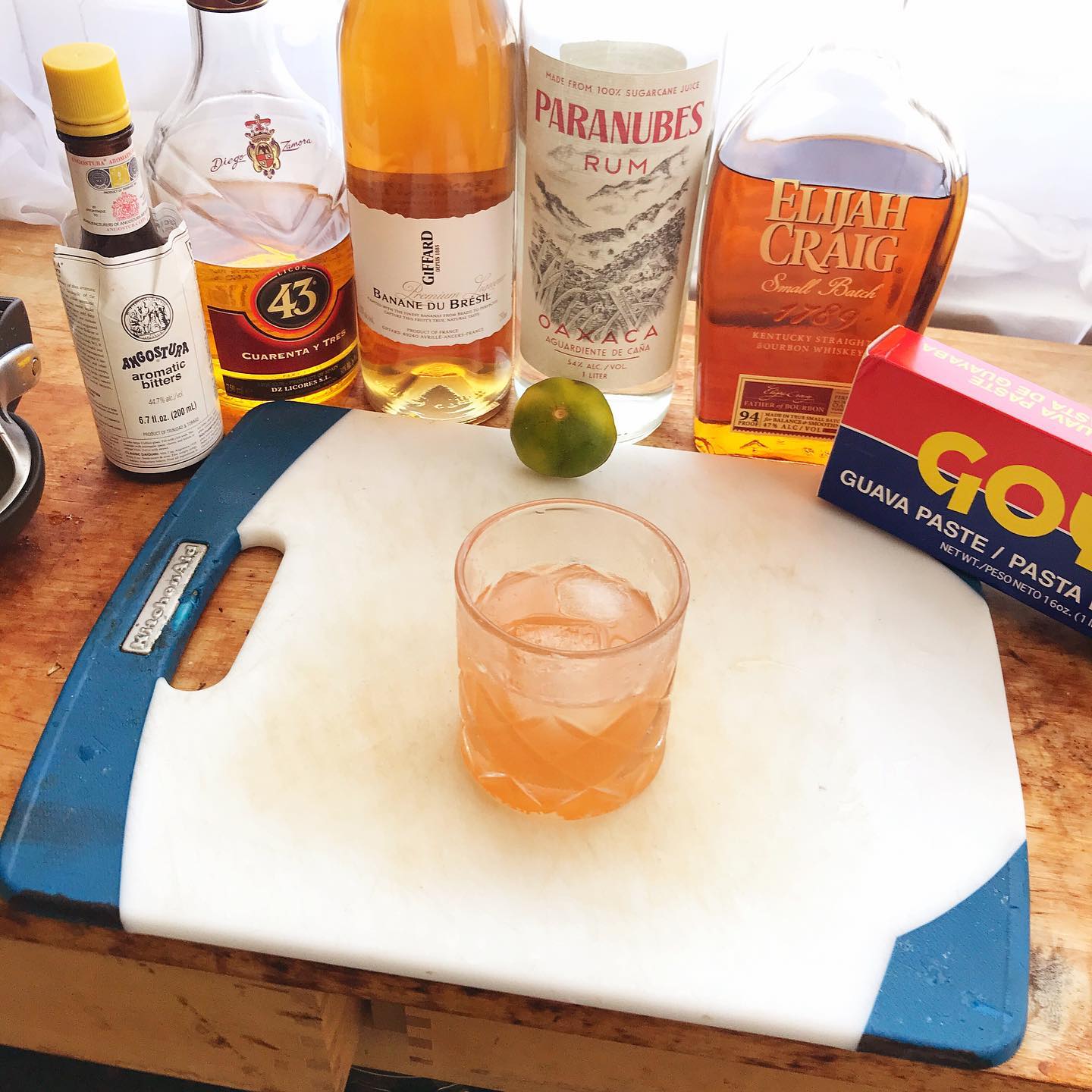 The tropical, floral sweetness of the guava paste works very well with the Oaxacan sugarcane rum (aguardiente) which also lends some subtle anise and funk. The bourbon and Licor 43 bring notes of vanilla and baking spice and the splash of banana liqueur also complements the tropical and funky flavors. The lime adds tartness and brightness while the Angostura brings some allspice and clove notes