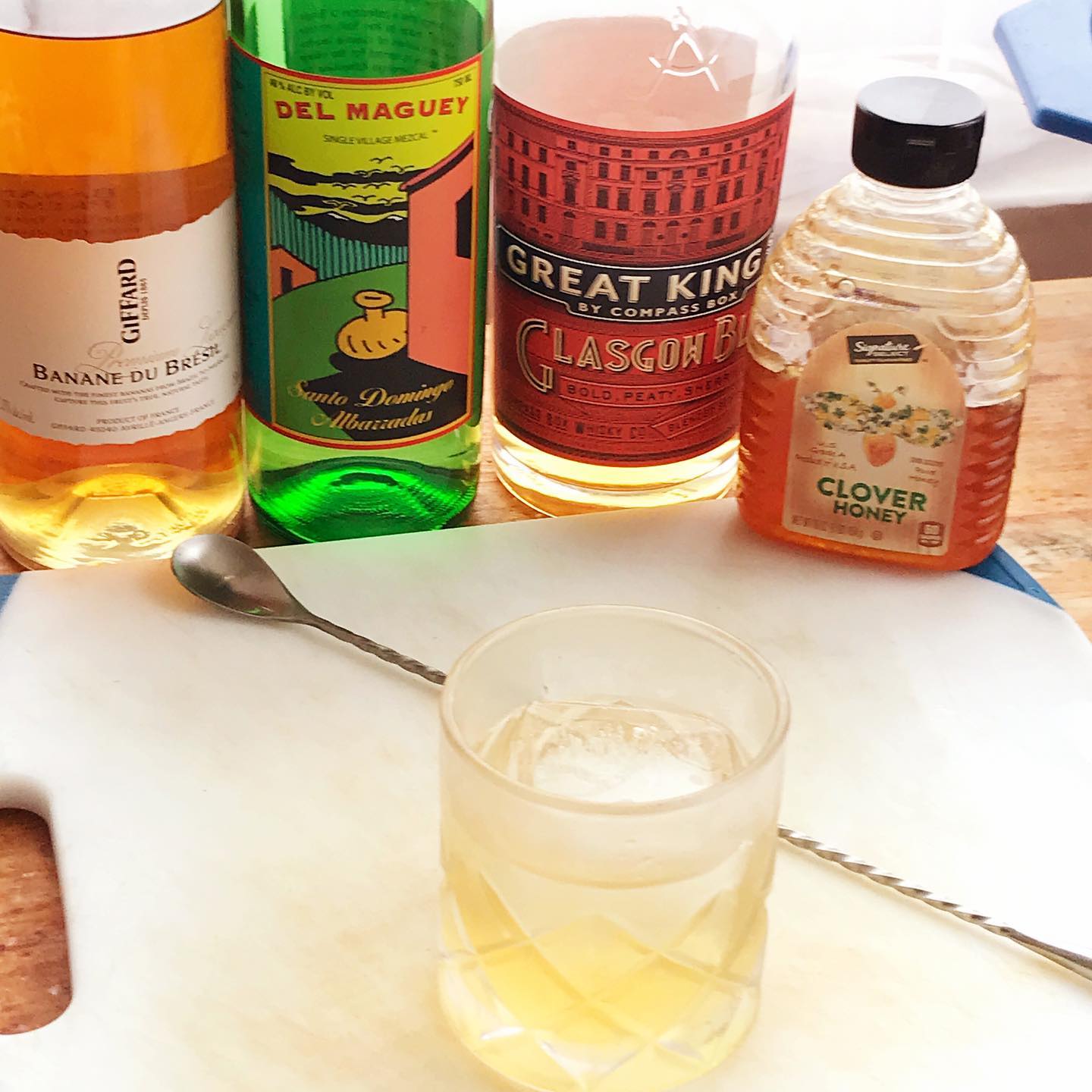 The ripe tropical fruit, black pepper, and smoke notes in the mezcal are supported by the honey and subtle peat notes in the blended scotch and provide an aromatic and flavorful base that complements the roasted ripe banana notes from the liqueur. The bit of honey syrup smooths out some edges to lead to a delicious sipping experience and the essential oils from the lemon twist brighten the drink