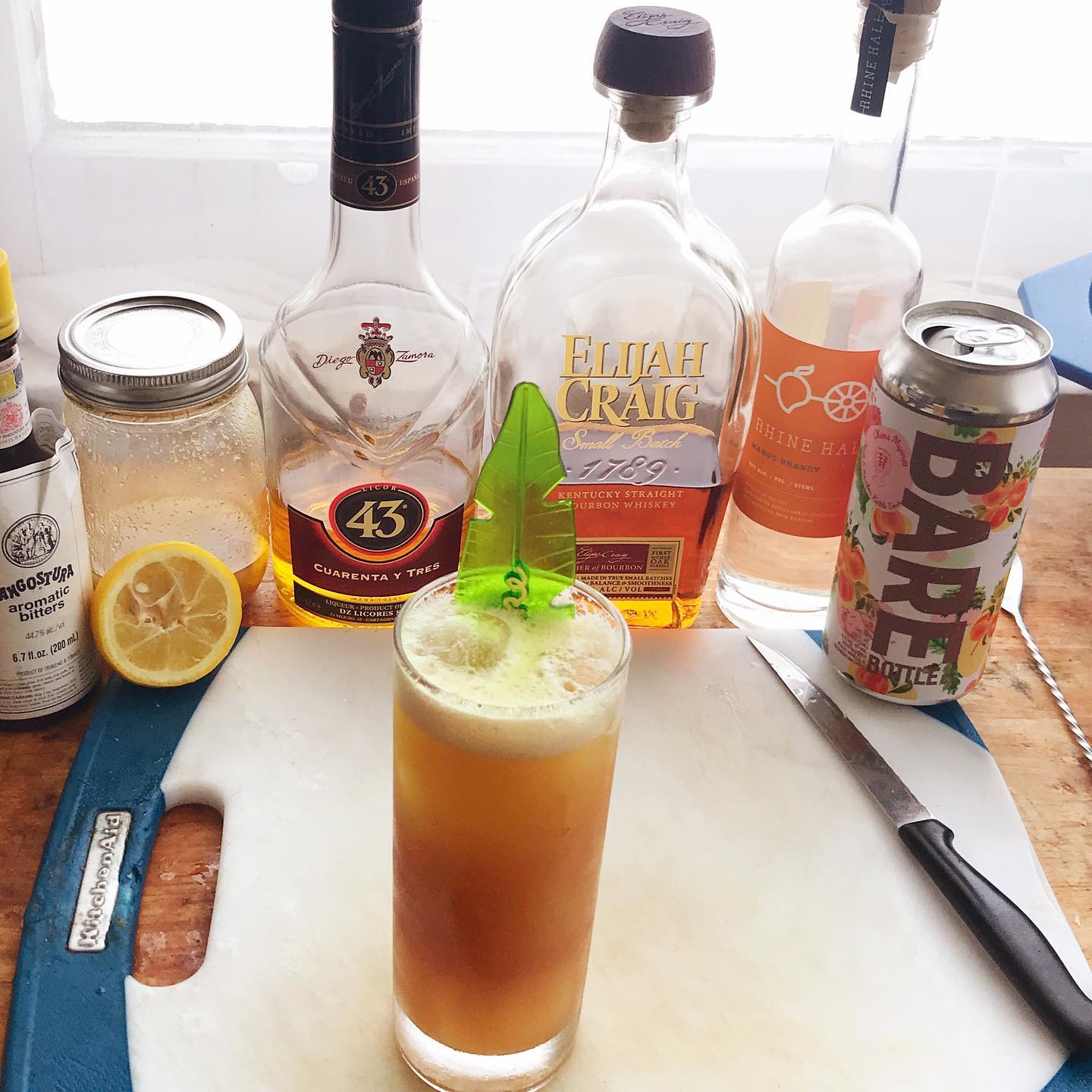 A refreshing tropical beer cocktail/highball riff on Lost Lake’s own delicious Hazy Lazy, Like, Kinda Crazy with peach, mango, vanilla, and ginger notes 🍑🥭🍹 The oak, vanilla, and baking spice notes in the bourbon provide a flavorful backdrop that allows the ripe mango notes from the eau de vie, the peach notes of the kettle sour, and the bite of the ginger syrup to shine. The vanilla liqueur boosts the vanilla notes, the Angostura bitters add some clove and allspice notes and the lemon adds brightness and acidity. Delicious on a sunny weekend afternoon